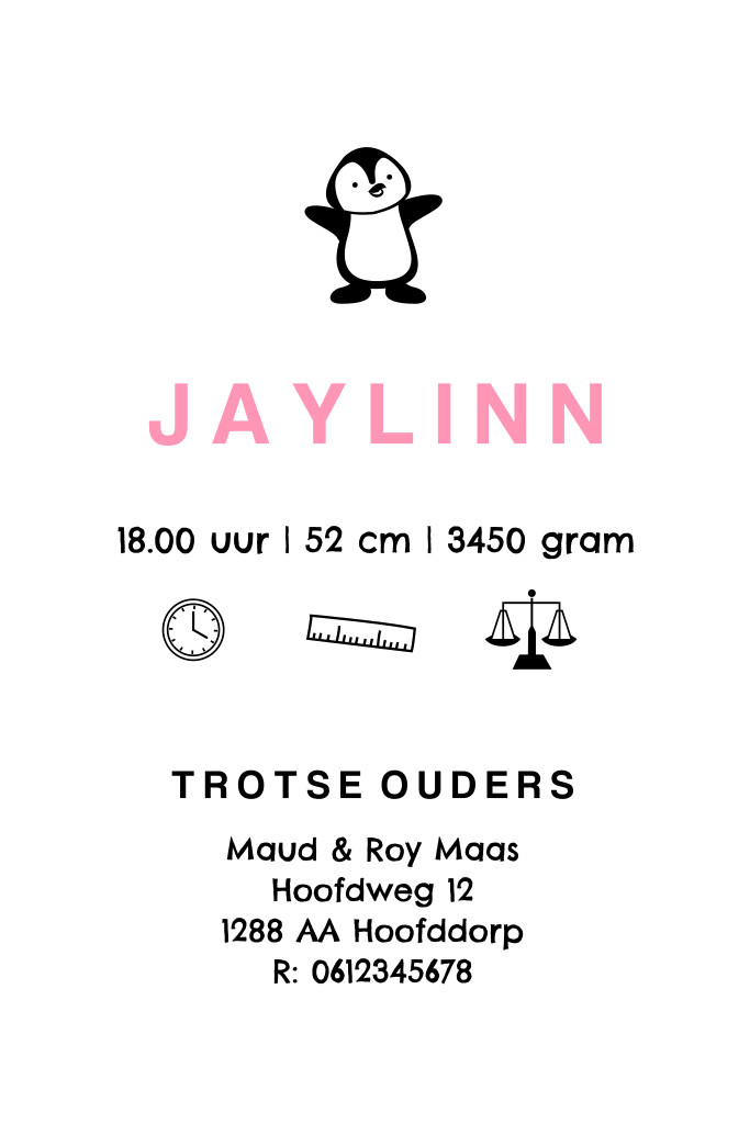 Vrolijk paspoort geboortekaartje met een pinguïn en een vliegtuigje. Vrolijk en hip! Schrijf aan de binnenkant een persoonlijke tekst.