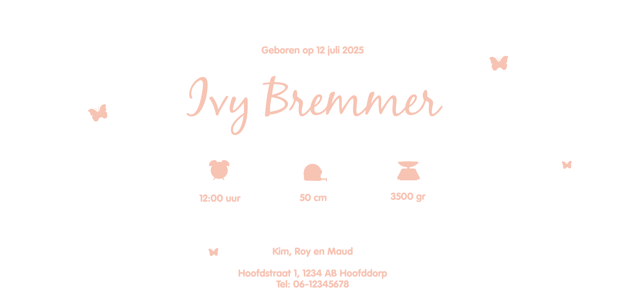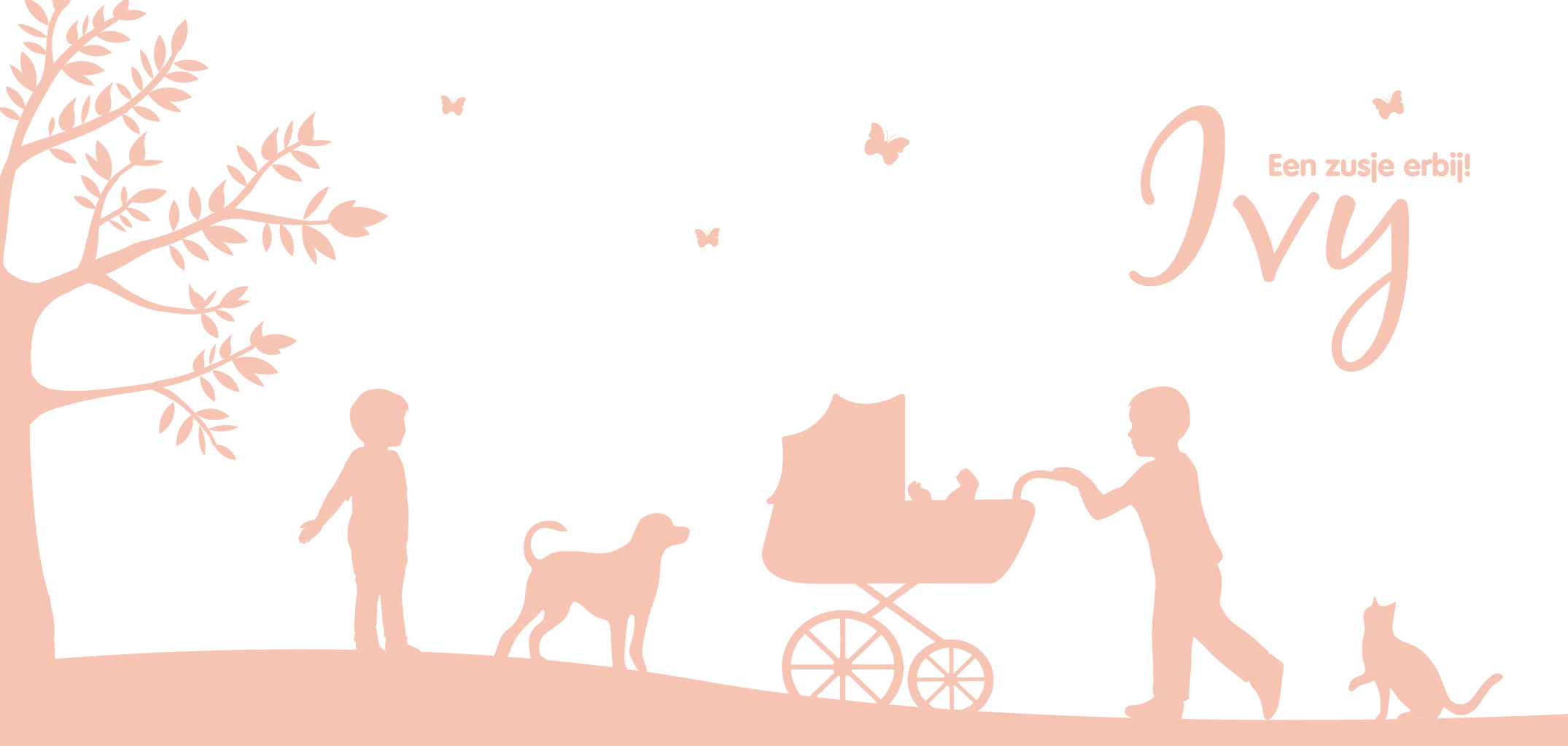 Heb je na twee zoons als derde kindje een dochtertje gekregen? Dan is dit geboortekaartje echt wat voor jou! Dit geboortekaartje heeft een silhouet van twee grote broers, een boom, hond, kat en een kinderwagen waar hun kleine baby zusje in ligt te slapen.
