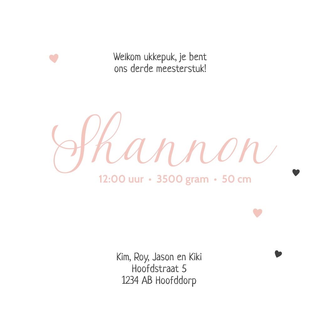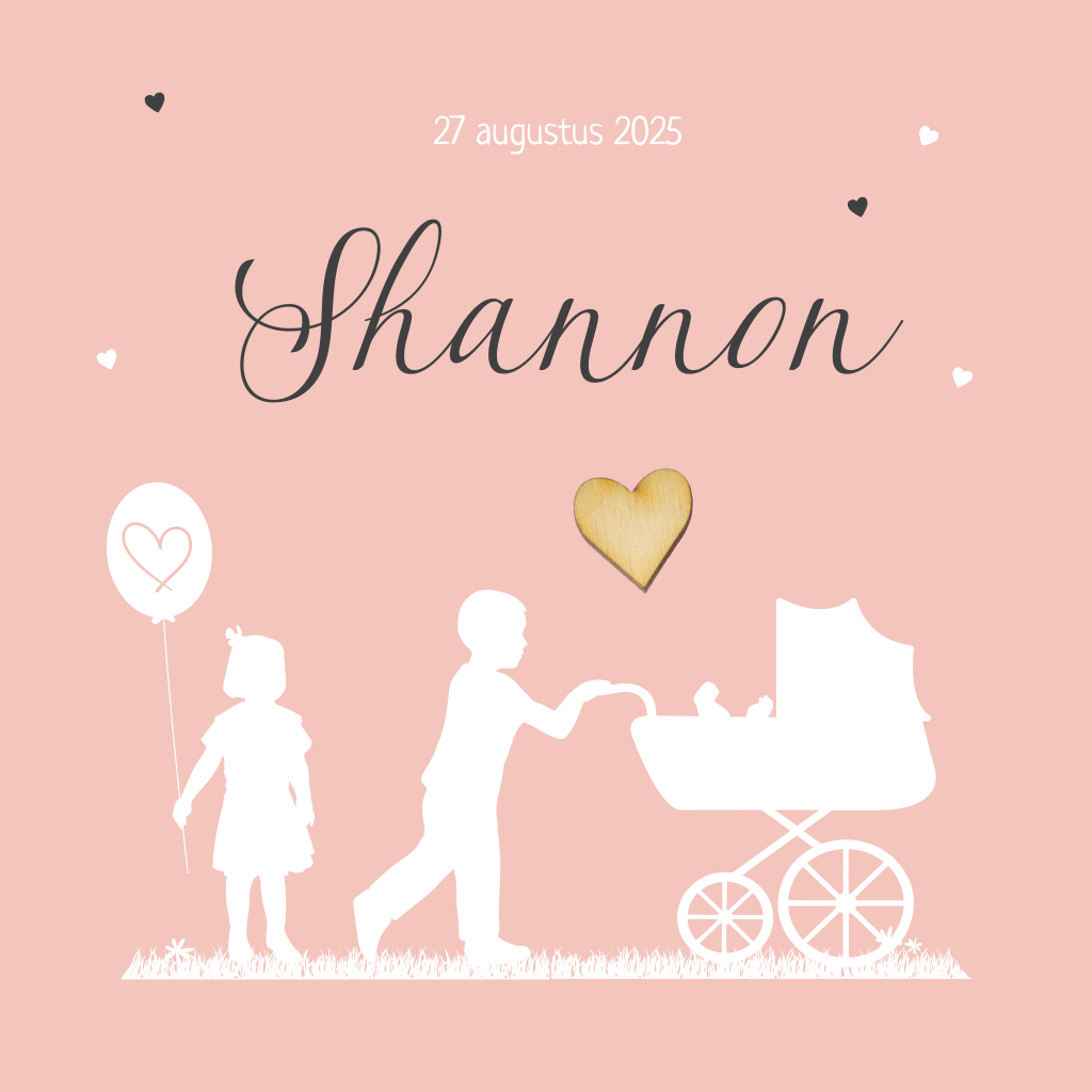 Lief geboortekaartje voor een klein meisje met een hippe silhouet van een broer en zus en hun kleine zusje in de kinderwagen. Plaats aan de binnenkant een mooie foto van de kleine meid zodat iedereen haar kan zien! Dit kaartje is extra speciaal omdat je er een échte houten hartje op kunt plakken!
