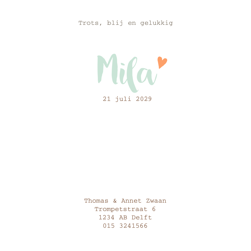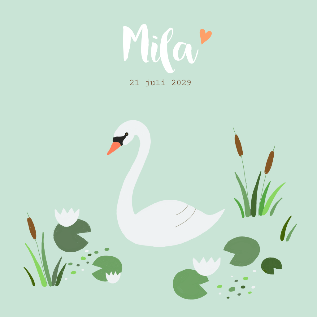 Een hip geboortekaartje voor een meisje met een illustratie van een zwaan en riet. Trendy is de mintgroene kleur! Maak hem compleet met eigen teksten en een bijpassende envelop.