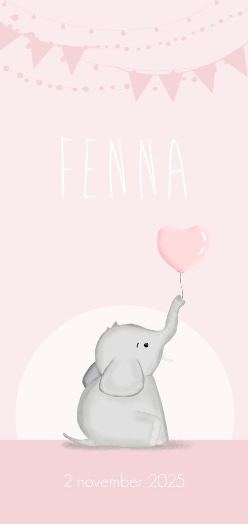 Schattig geboortekaartje voor een meisje. Met een illustratie van een klein baby olifantje op een lichtroze achtergrond met vlaggetjes. Het kleine olifantje houdt een lichtroze ballon vast. Wil je liever een andere kleur of een ander lettertype? Dit heb je zo gedaan! In de online editor creëer je precies de kaart die bij je past.