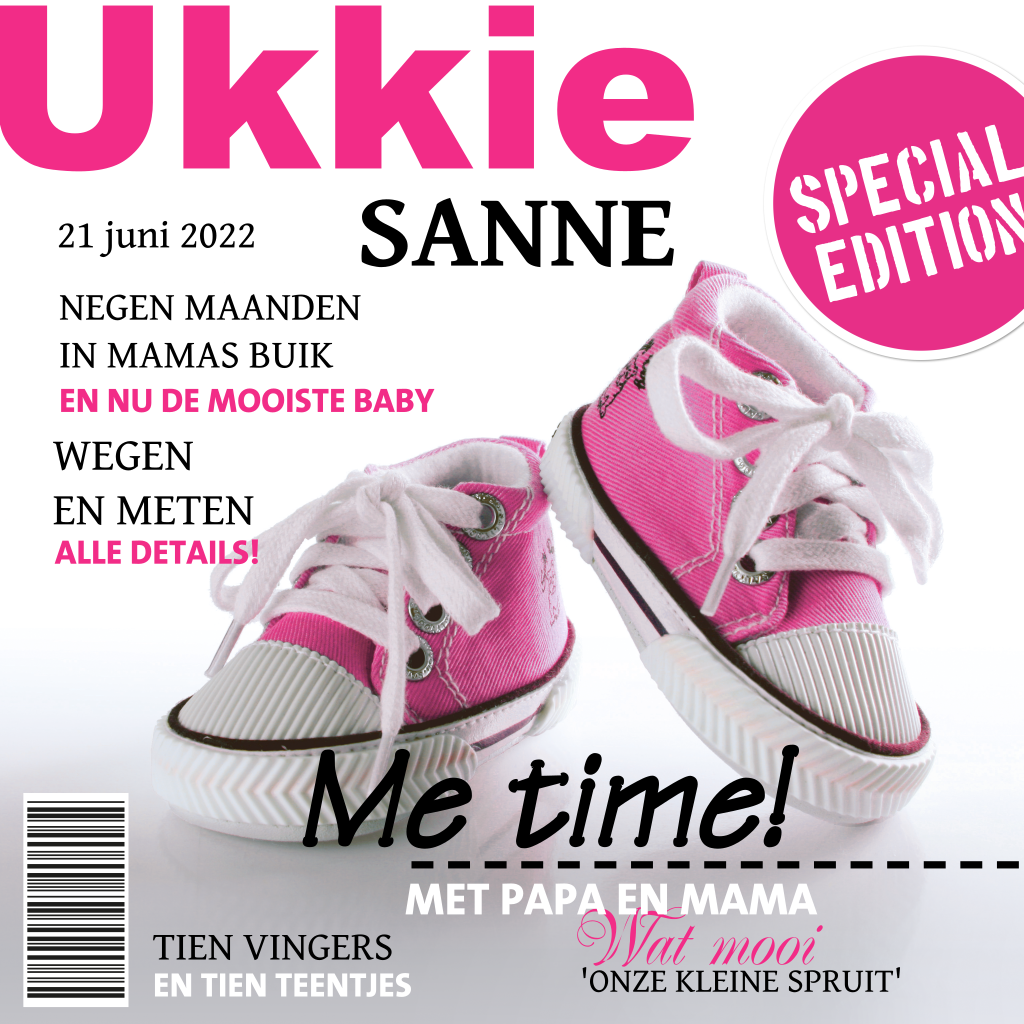 Een super originele geboortekaart voor jouw kleintje! De hele kaart is ontworpen alsof het een tijdschrift is. Op de voorkant zie je lieve babyschoentjes en aan de binnenkant van de kaart kun je ook een foto toevoegen. De teksten en kleuren kun je nog geheel naar wens aanpassen in de online-editor.