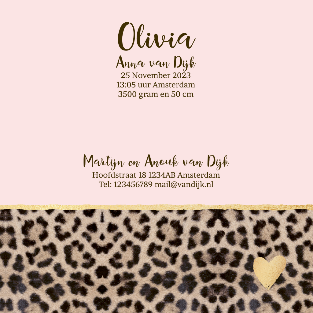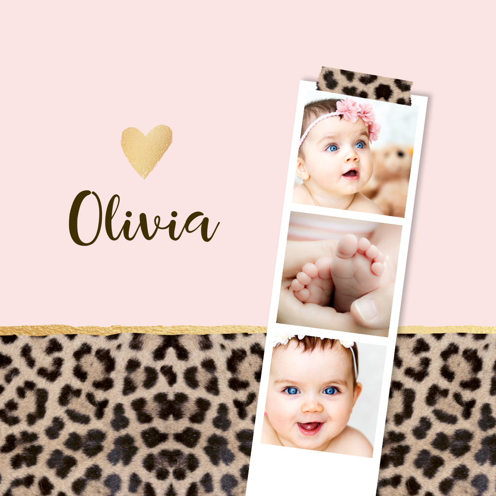Panterprint op je geboortekaartje heeft altijd een stoere en hippe uitstraling! In combinatie met een lichtroze achtergrond met een goudkleurige strook en hartje is dit een toffe babykaart voor een meisje. Uniek is de fotostrip waarin je drie foto's kunt plaatsen die vast is getaped met panterprinttape!