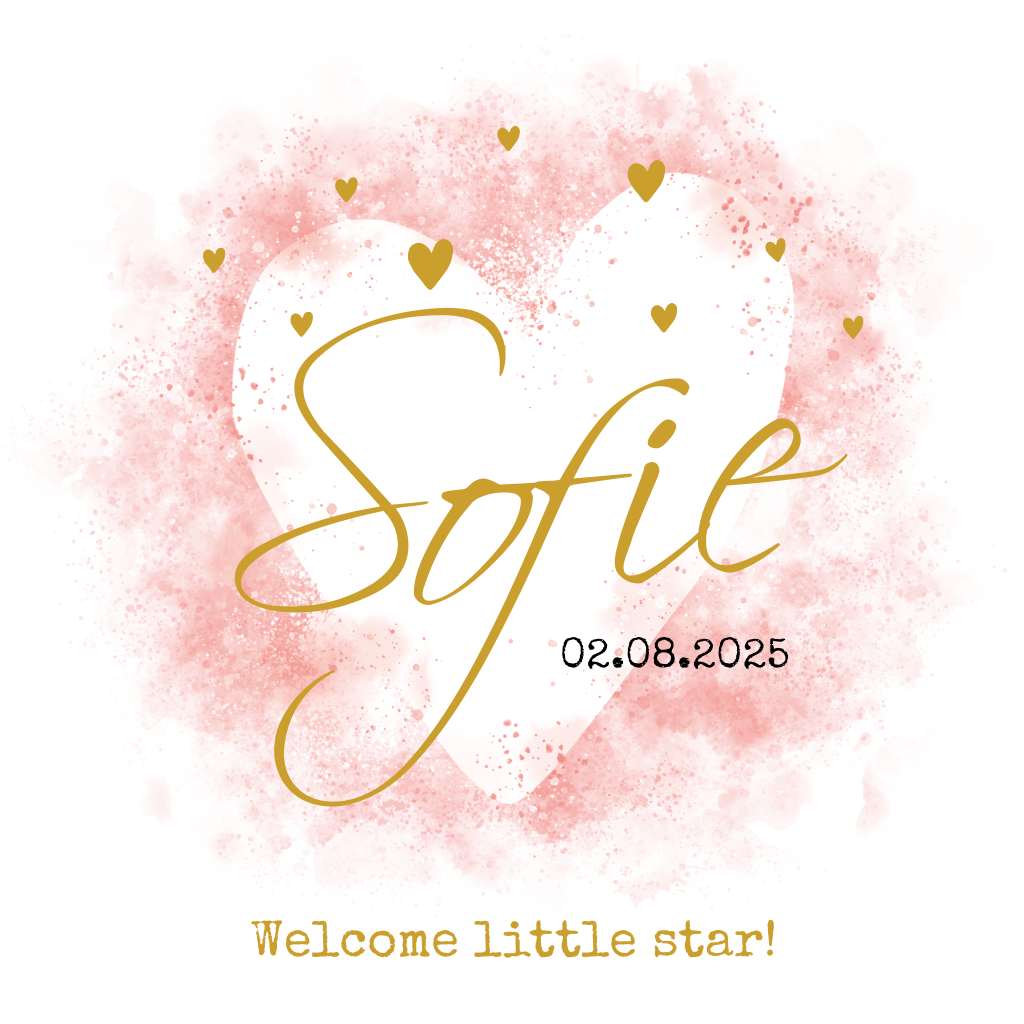 Welcome little star! Dit romantische geboortekaartje heeft een classy kleurencombinatie van roze, goudlook en wit. Op de voorkant komt een groot hart naar voren met roze brush op de achtergrond en kleine goudkleurige hartjes. Aan de binnenkant is de kaart nog versierd met sterretjes.