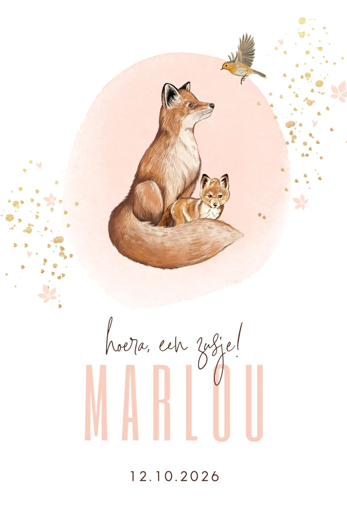 Schattig toch dit geboortekaartje voor jullie dochter?! Op het witte kaartje staat een lichtroze cirkel waar een tekening van een grote en kleine vos op staat. Erboven fladdert een lief vogeltje, de blaadjes en spetters maken het compleet, leuk voor als jullie kindje in de herfst wordt geboren!