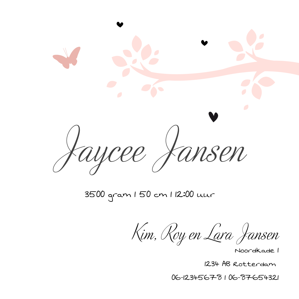 Schattig geboortekaartje voor je tweede dochtertje met een illustratie van een boom met grote zus op de schommel en klein zusje die in de kinderwagen ligt. De hartjes en vlindertjes maken dit kaartje echt lief! Plaats aan de binnenkant een foto van de kleine meid zodat iedereen haar kan bewonderen!