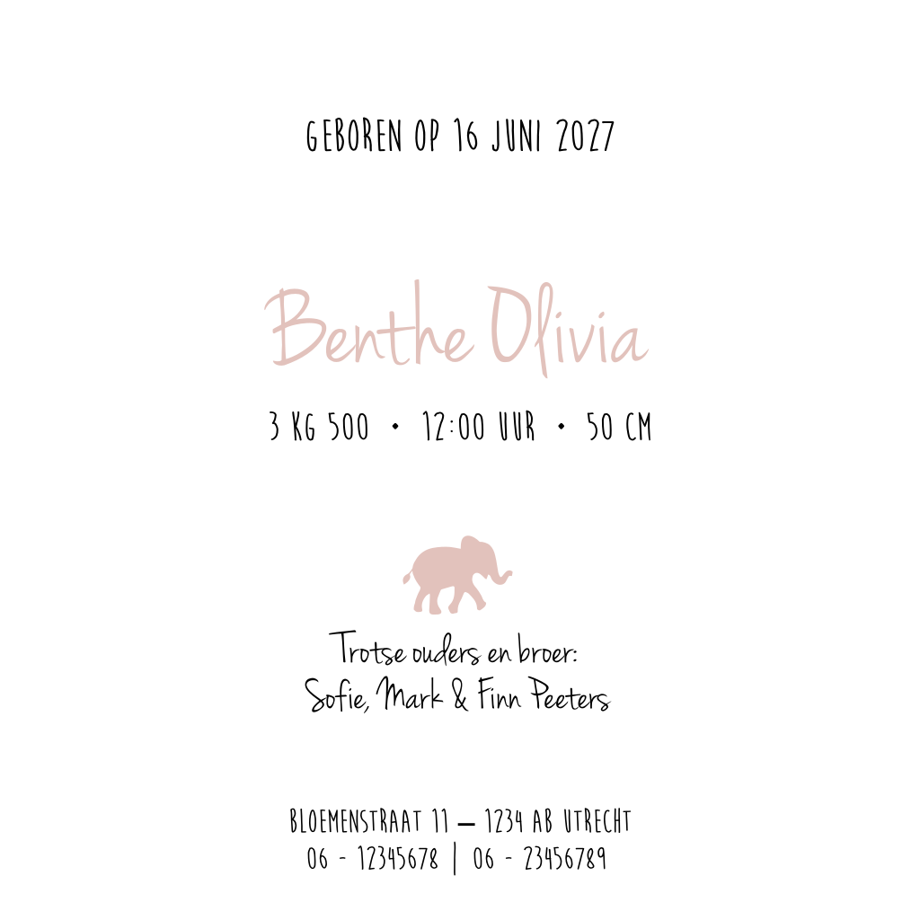 Hip geboortekaartje voor zusje met silhouet van olifantjes