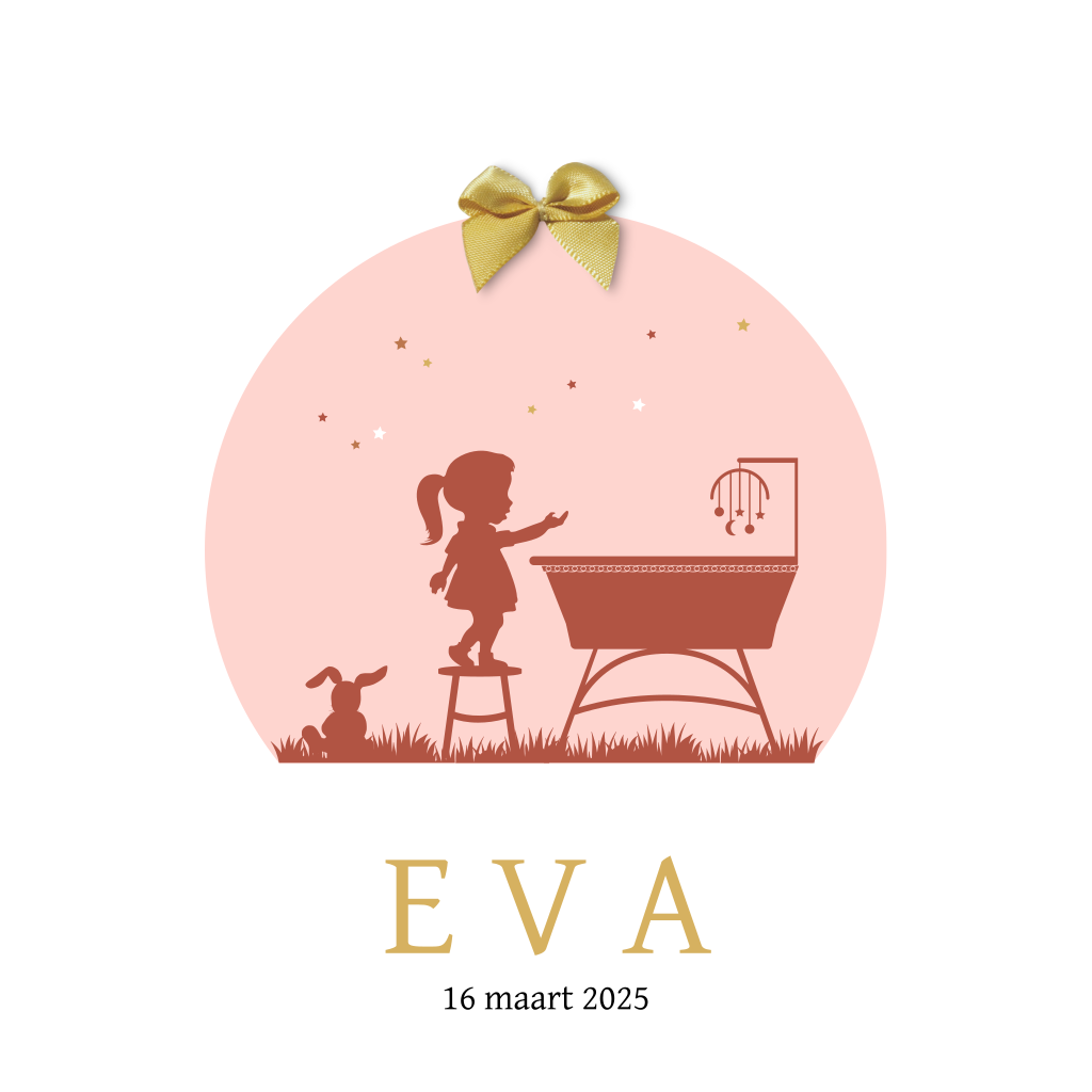 Lief geboortekaartje met silhouet van wieg en grote zus en een knuffel-konijn. Je kunt een strikje op het rondje plakken of het weglaten. Het strikje koop je er los bij.
