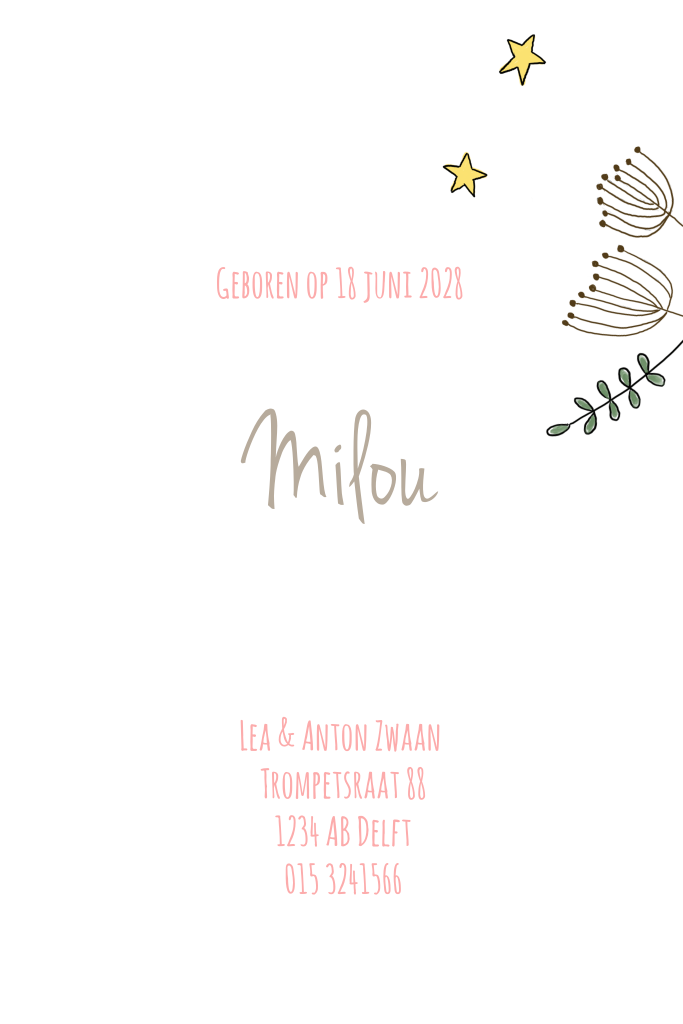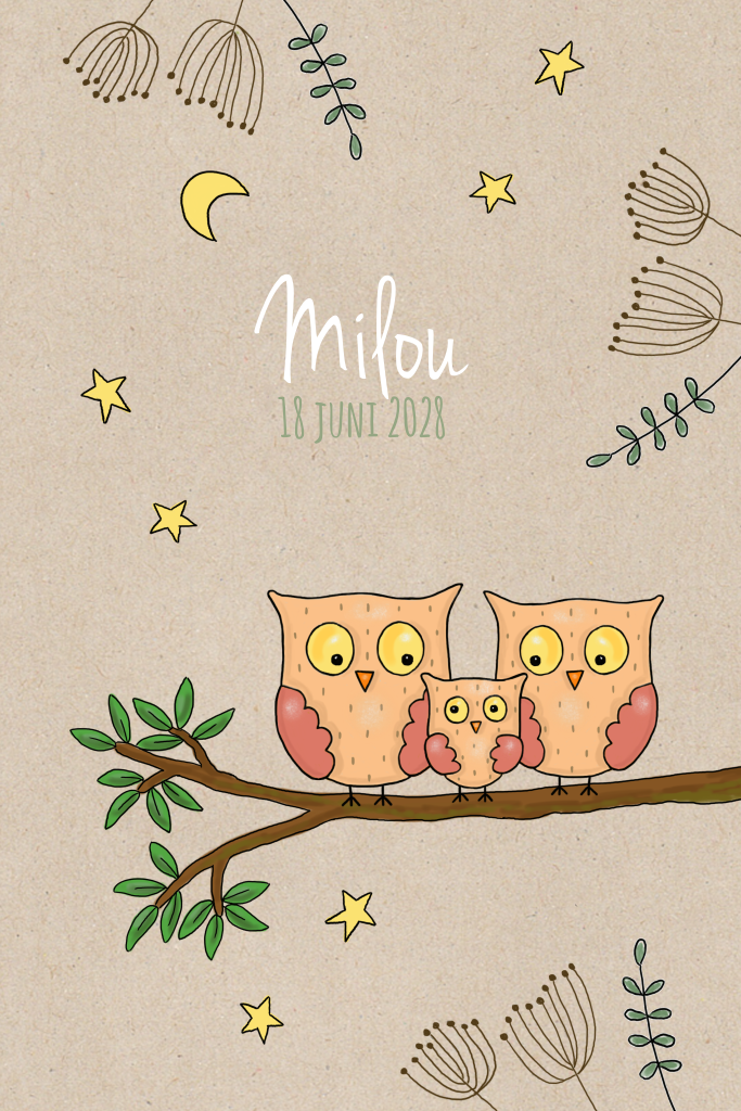 Een trendy geboortekaartje met illustraties van lieve uiltjes op een tak, sterretjes, maantje, takjes en bloemen. Leuk voor een dochter! De achtergrondkleur en lettertypes zijn naar wens aan te passen.