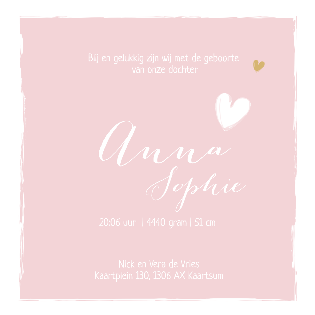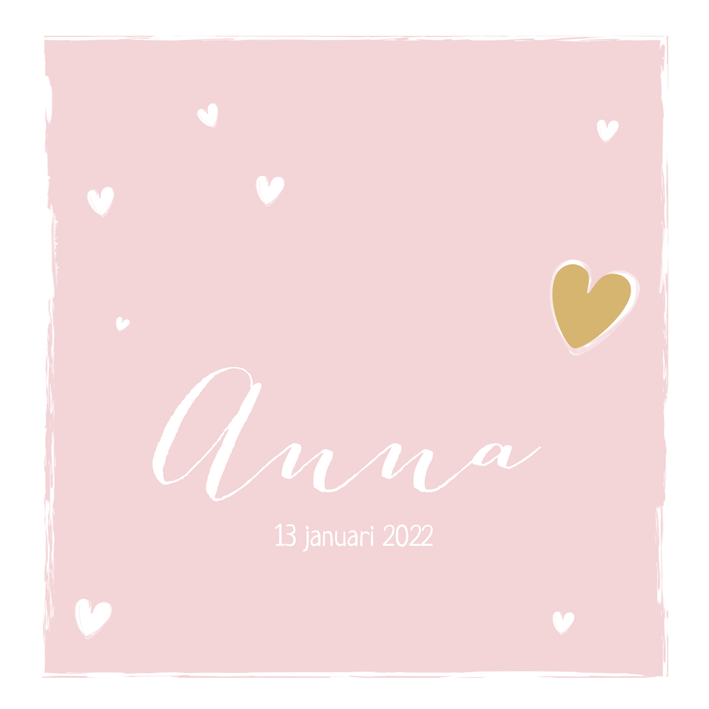 Lief geboortekaartje voor meisje met wit kader en lieve getekende hartjes met 1 mooi goudkleurig hartje aan het eind van de babynaam.