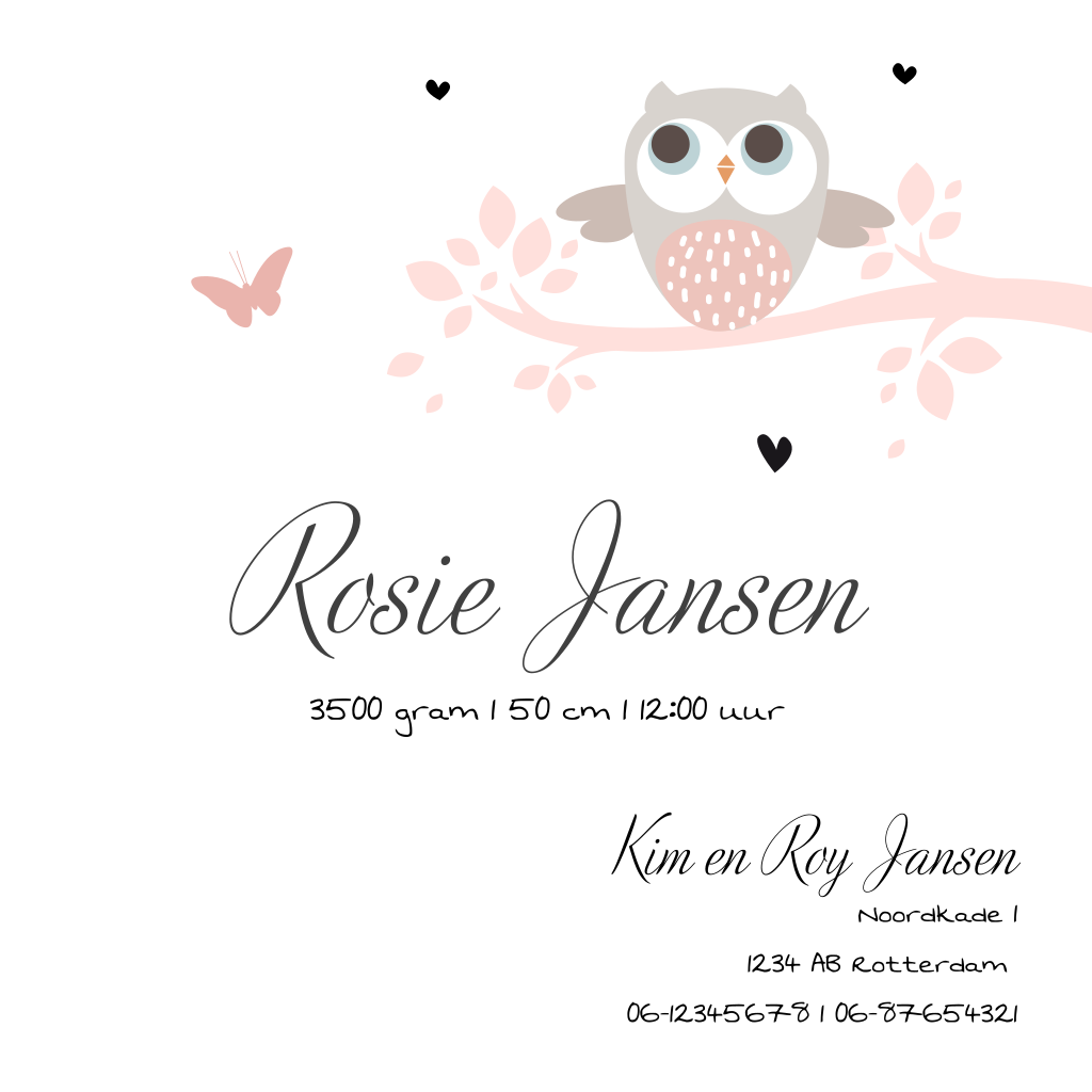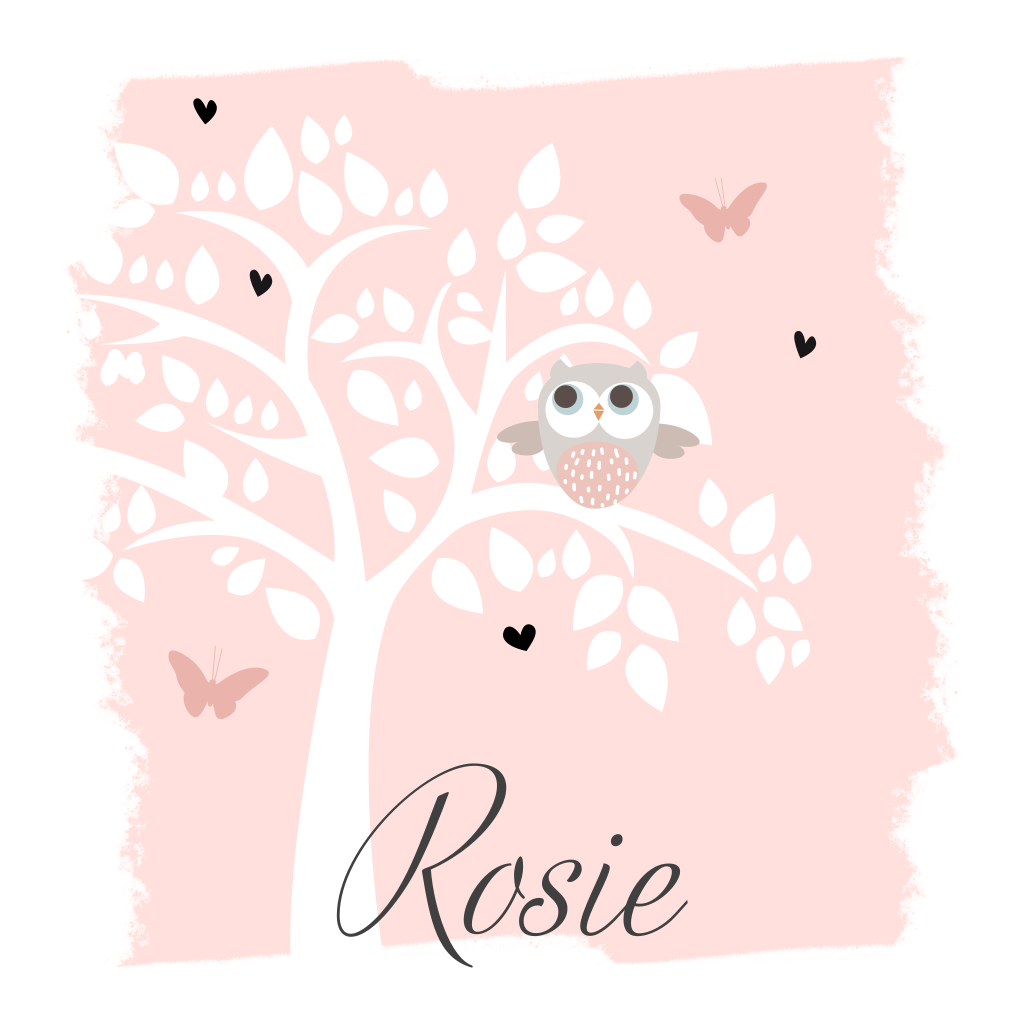 Romantisch geboortekaartje voor een meisje met roze achtergrond, een uil en een silhouet van een boom. In de binnenkant van het kaartje kun je een foto plaatsen van je baby.