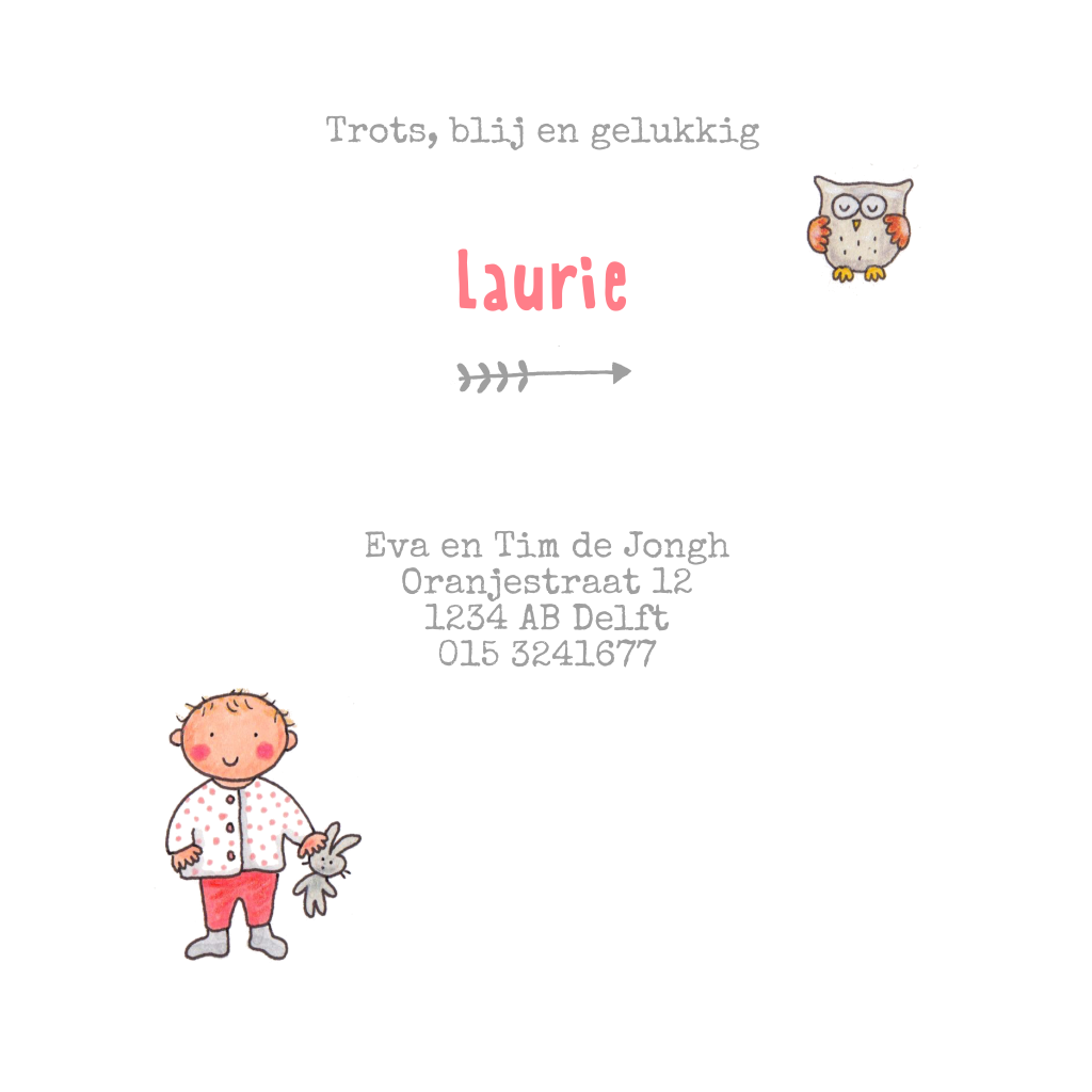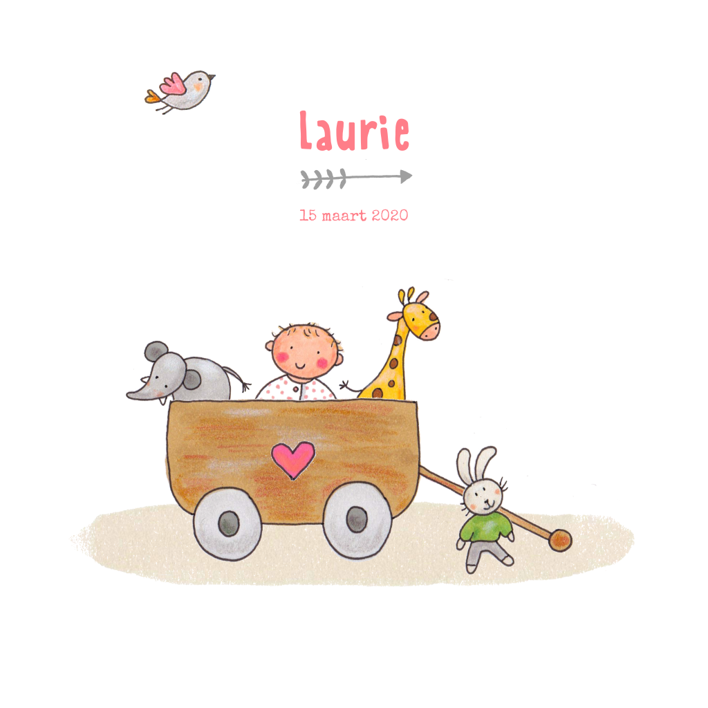 Een lief, getekend kaartje voor je pasgeboren dochtertje met een baby meisje in een bolderkar en schattige knuffels zoals een olifant, giraffe en konijntje.