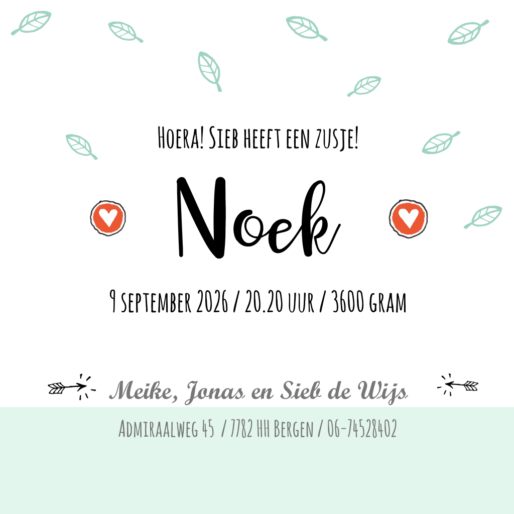 Schattig kaartje om de geboorte van je dochter aan te kondigen. Mintgroen met stipjes patroon, hartjes en tekening van een baby zusje in een karretje samen met haar grote broer.