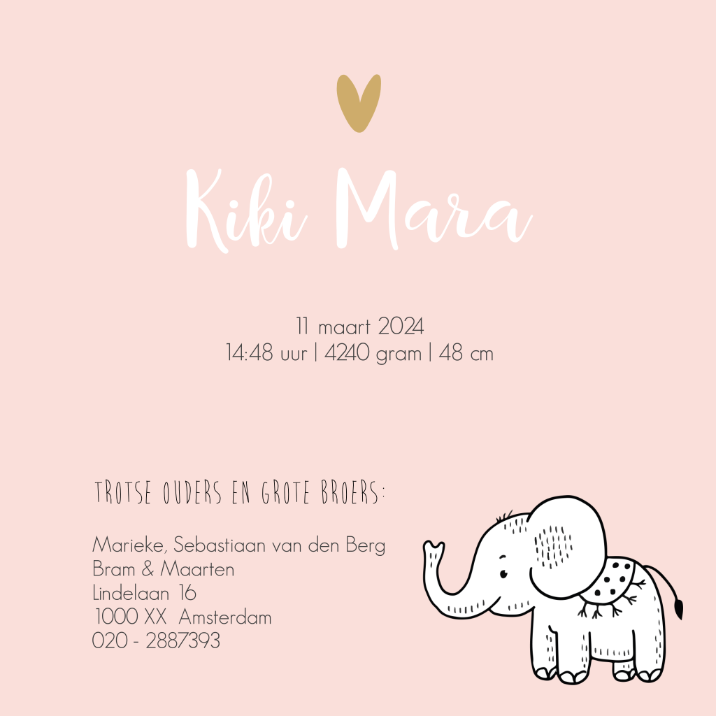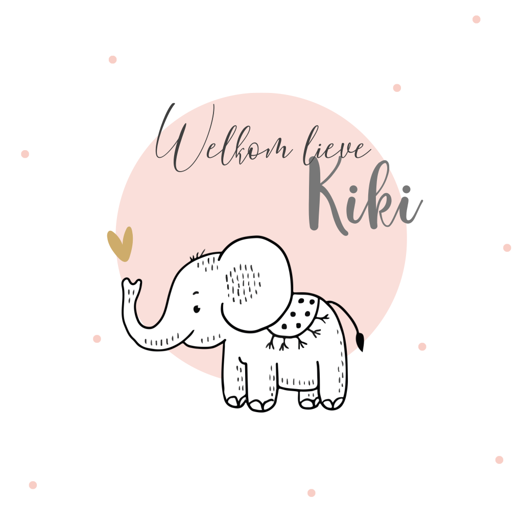 Wat een schattig babykaartje om de geboorte van jullie dochter aan te kondigen! Op deze kaart staat een leuke olifant op een roze cirkel. Het hartje maakt deze kaart extra lief!