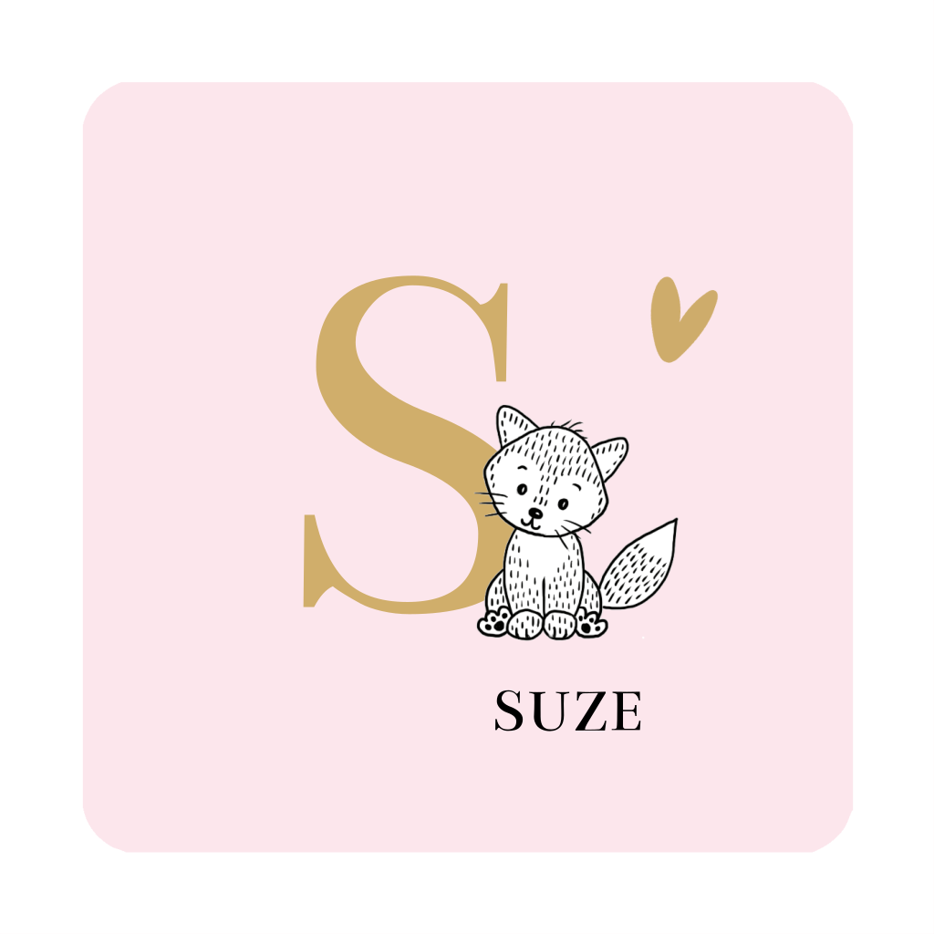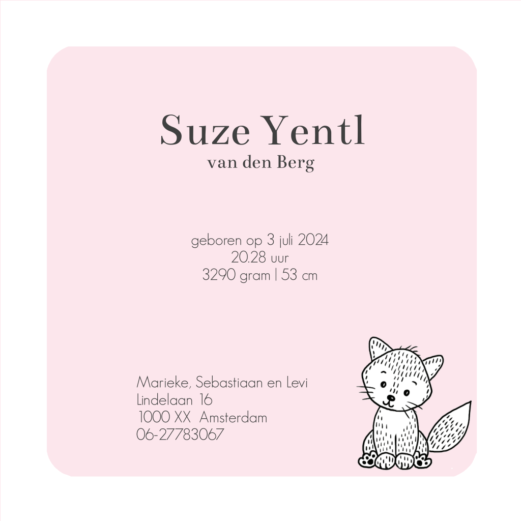 Schattige kaart voor de geboorte van jullie dochter! Het vosje staat bij de initiaal van de babynaam en op een roze achtergrond. Pas makkelijk de tekst en de initiaal aan in de editor.