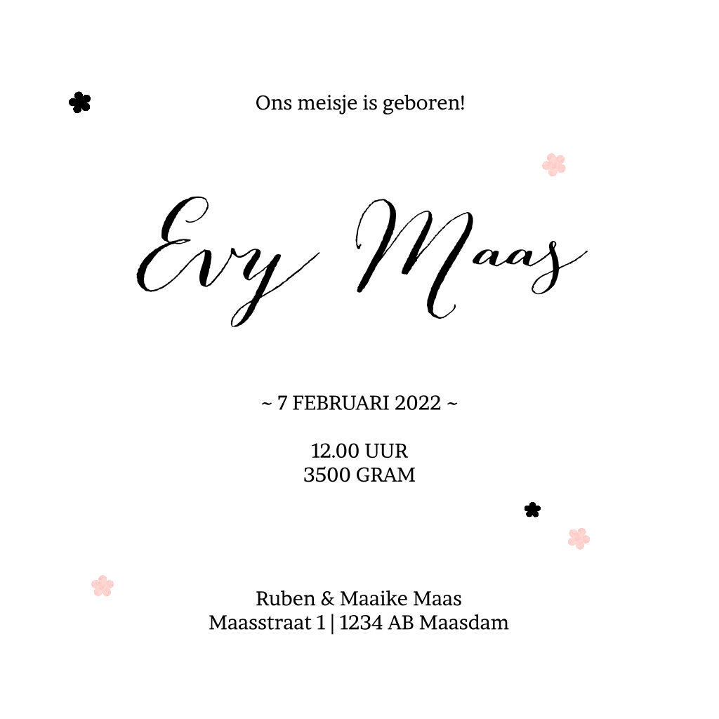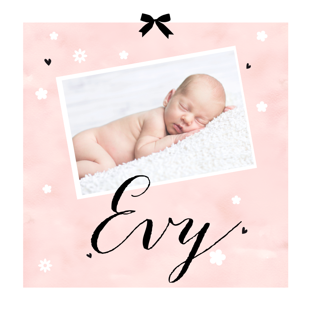 Aquarel geboortekaartje met silhouet bloemetjes en hartjes en met een zwart silhouet-strikje. Op de voorkant kan je eenvoudig de foto van je kleintje plaatsen.