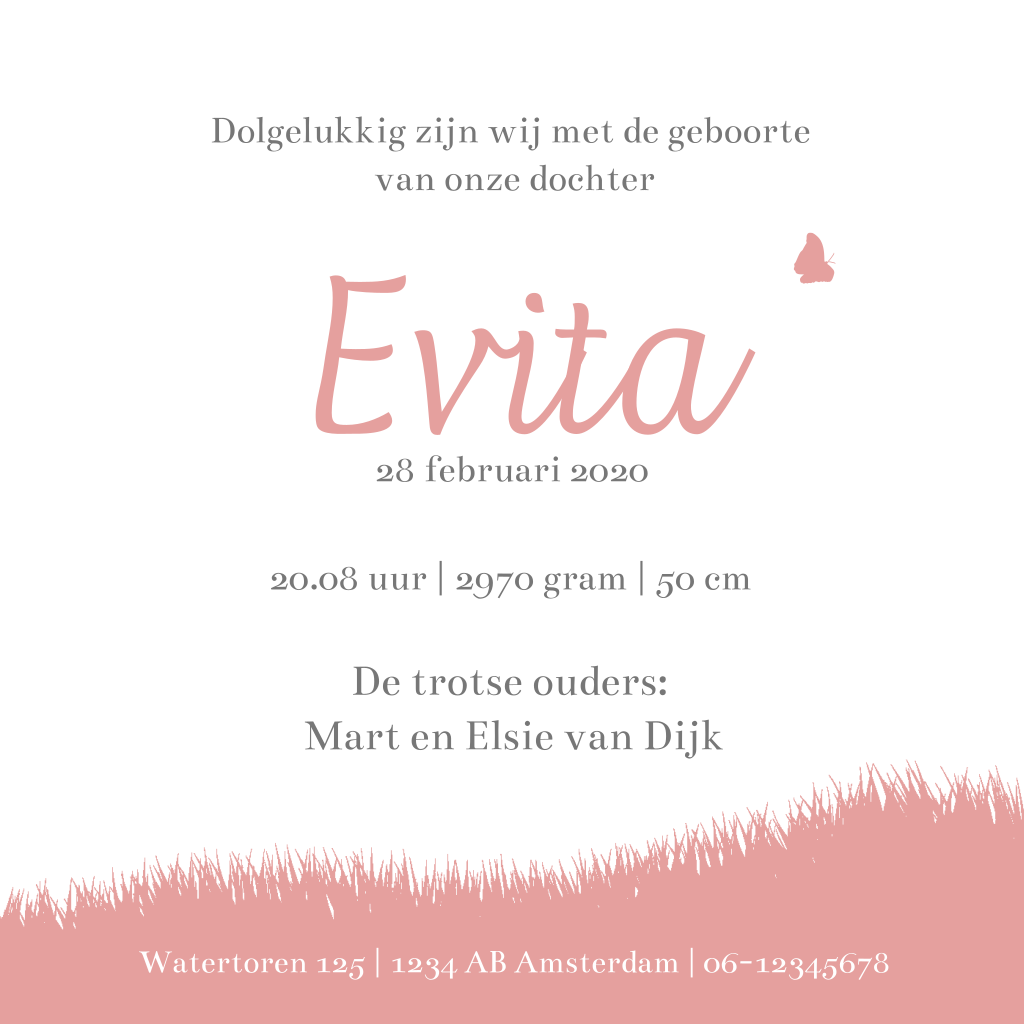 Een mooie boom en een meisje op een schommel: dat is het thema van dit lieve geboortekaartje. De vlindertjes maken het helemaal af.