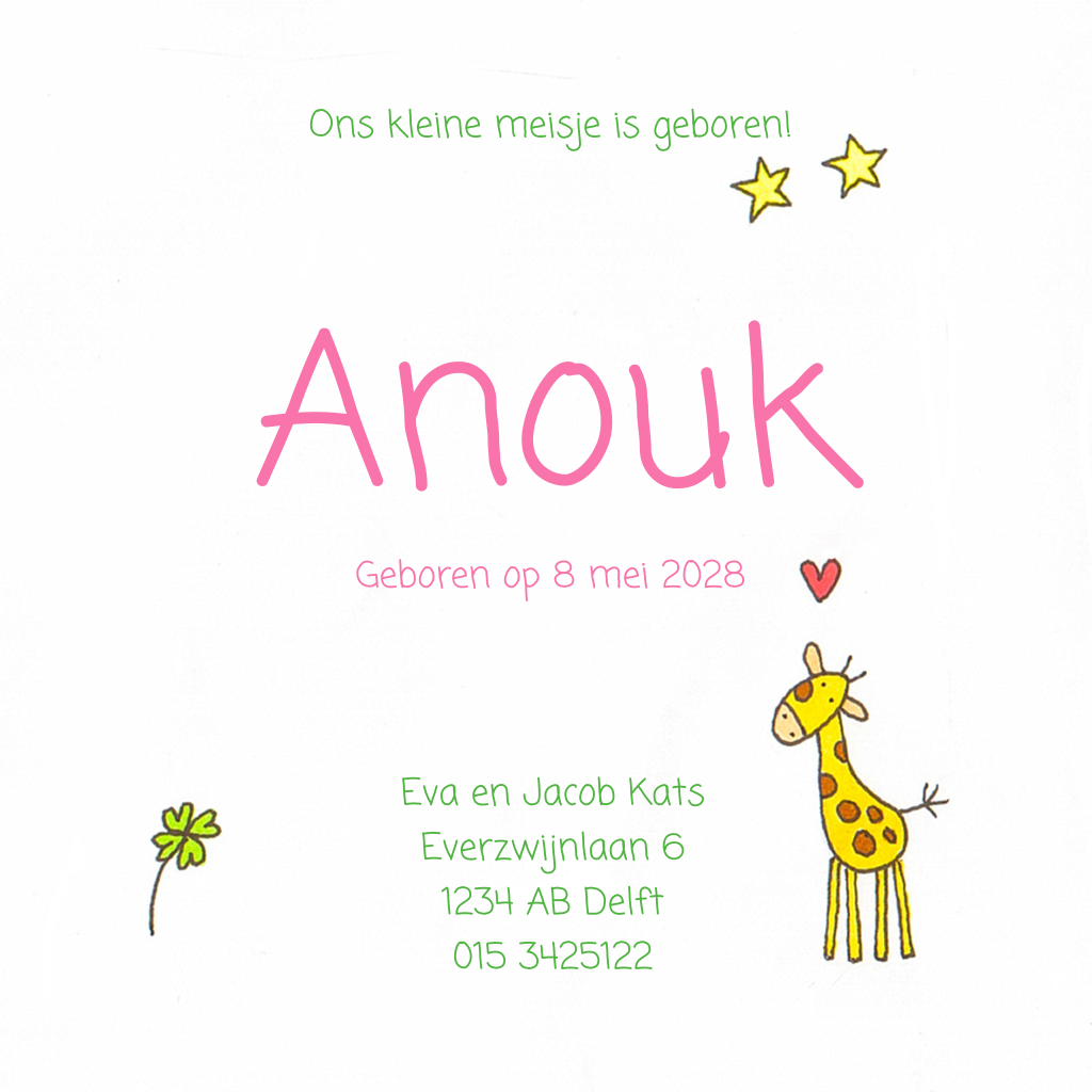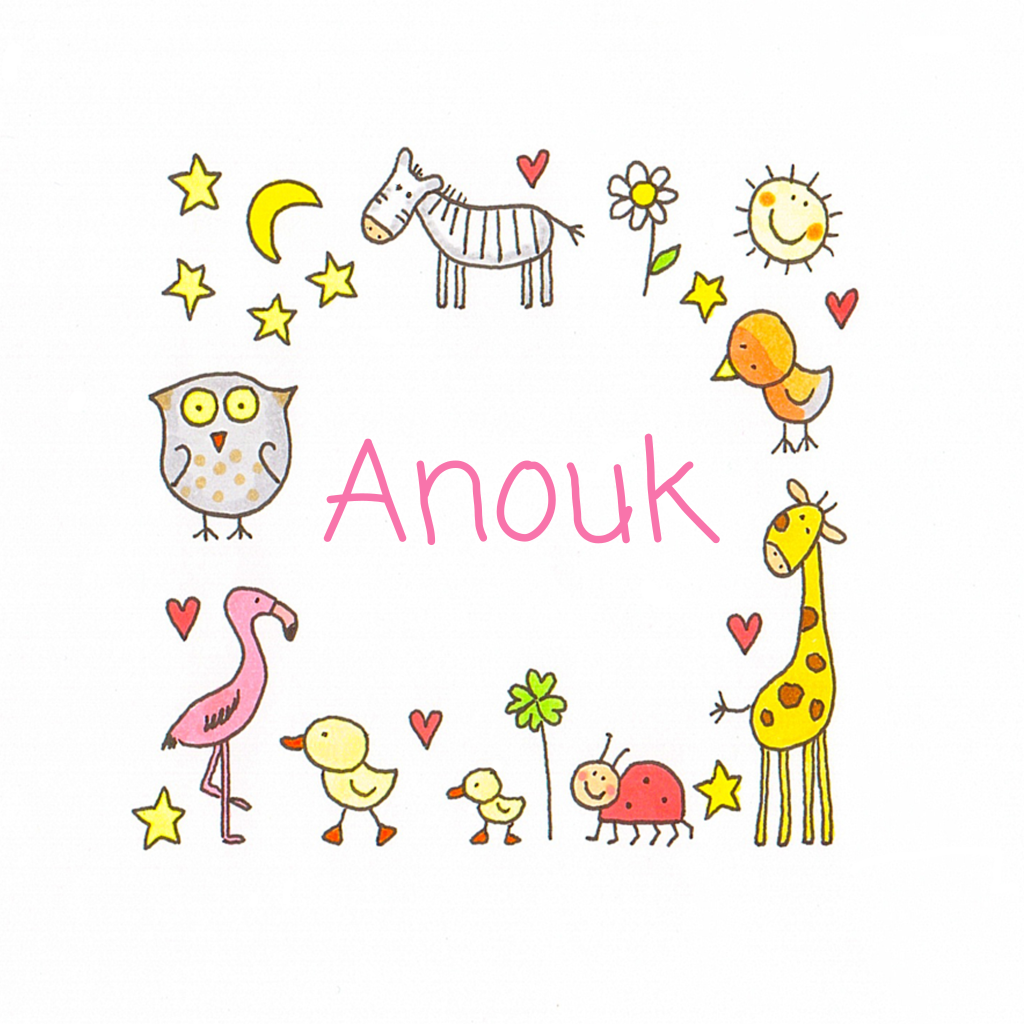 Bij dit kaartje staat de naam van jouw kindje centraal, binnen een kader van schattige tekeningen. Met lieve elementen, geschikt voor een meisje.