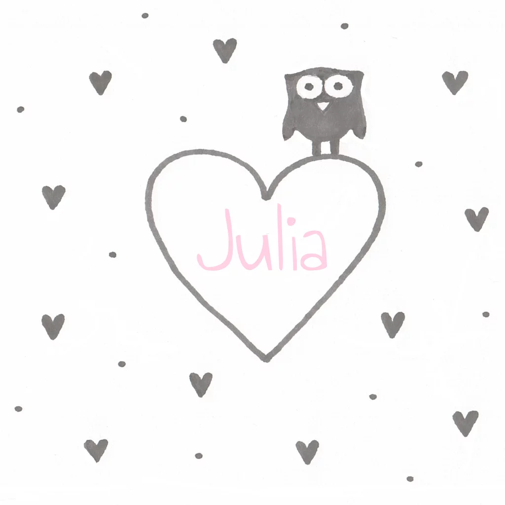 Een origineel kaartje met een bosuil op een hart. Er omheen kleine hartjes en stippen. Getekend in grijs.