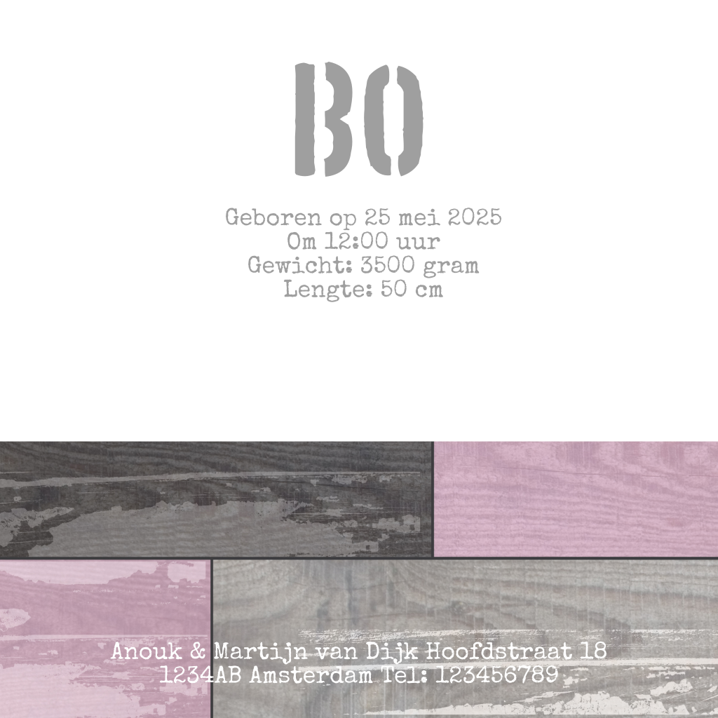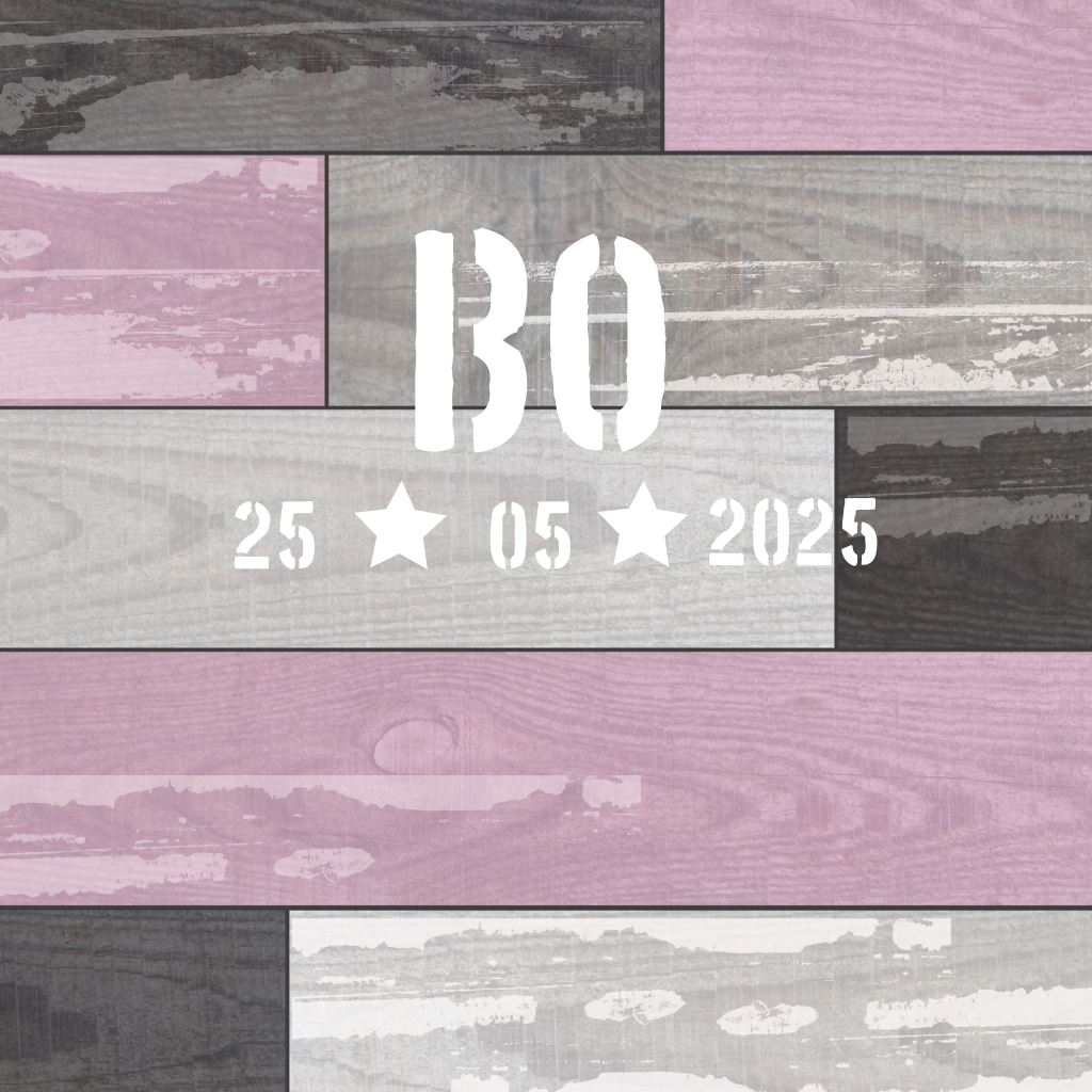 Dit stoere geboortekaartje voor een meisje heeft een houtprint met roze en grijze kleuren. De sterretjes tussen de cijfers staan hier goed bij.