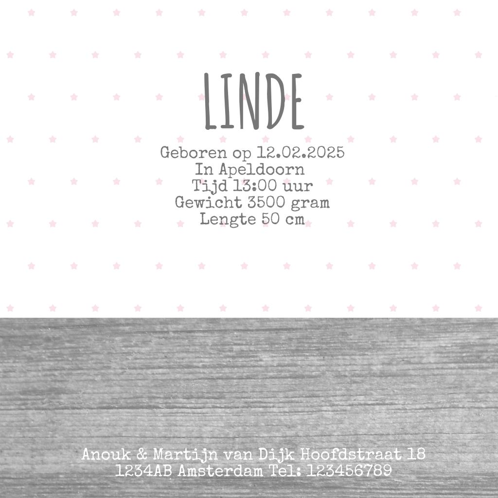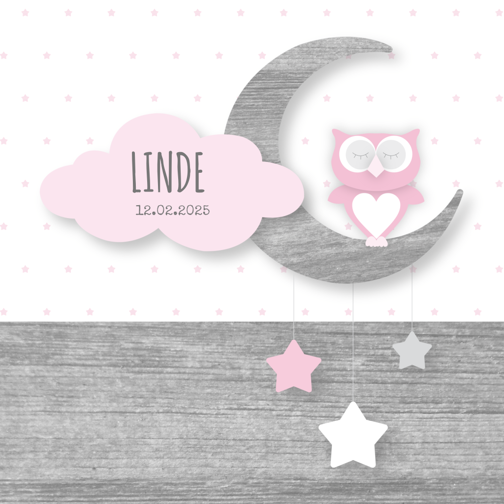 Een lief en hip geboortekaartje met een uiltje, een maan, sterren en houtlook. Pas zelf de tekst aan. De losse onderdelen kun je verschuiven en vergroten of verkleinen.