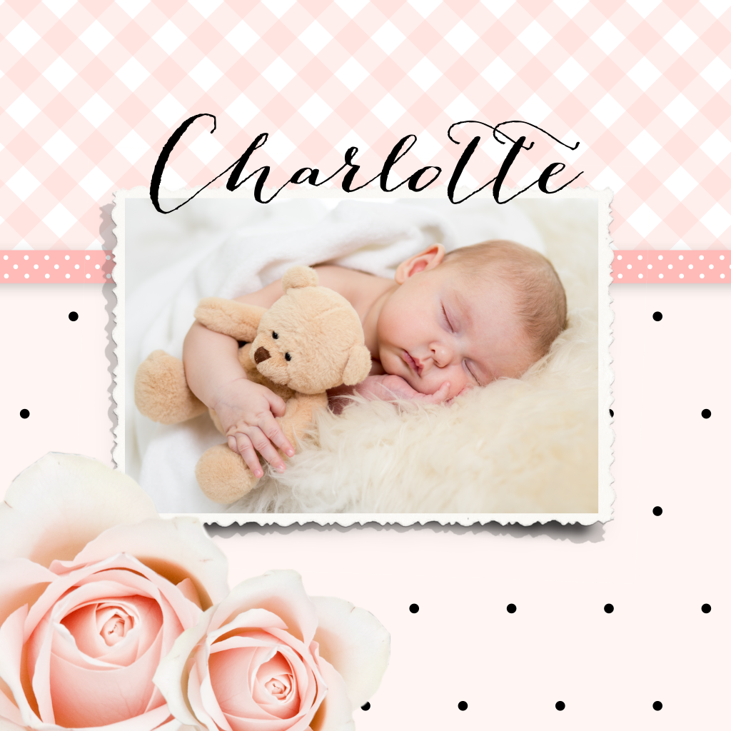 Foto geboortekaartje met klassieke ruitjes een foto van je baby op stippen en rozen. De foto heeft een vintage look en feel.