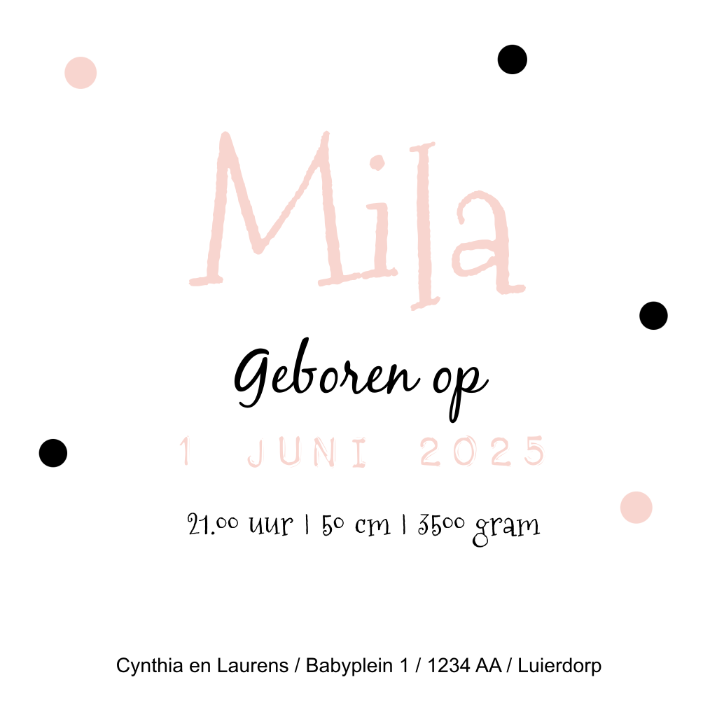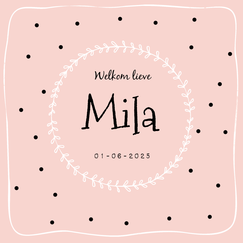 Lief geboortekaartje voor een meisje in zacht roze, met zwarte stippen en takken kransje.