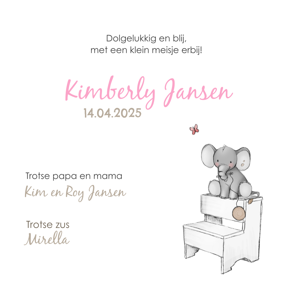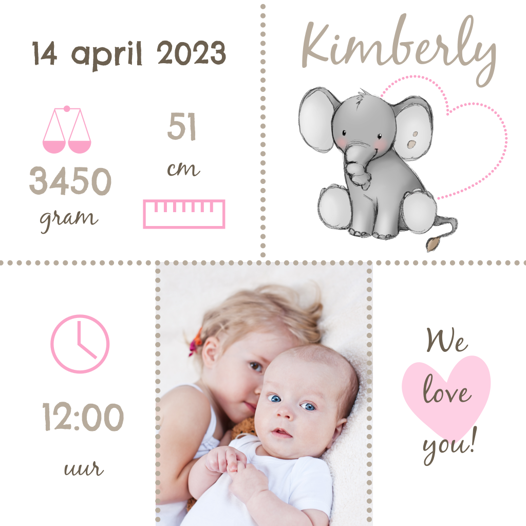 Die lieve geboortekaartje is speciaal voor de geboorte van een meisje. Met een foto van voetjes laat je zien dat je een baby gekregen hebt en het olifantje fleurt het kaartje op. Schrijf bij de icoontjes de geboortedetails.