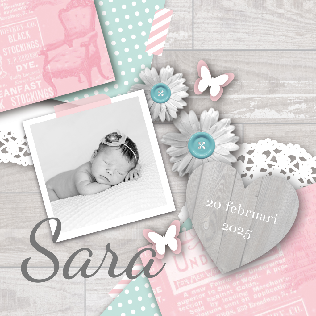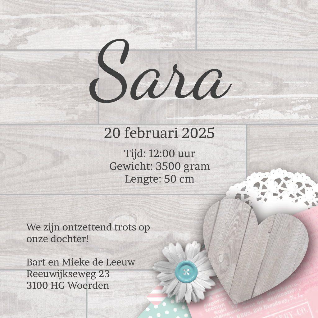 Een mooi en lief geboortekaartje met eigen foto, houtprint, hart en andere leuke elementen. Vervang zelf de foto en pas de teksten aan.