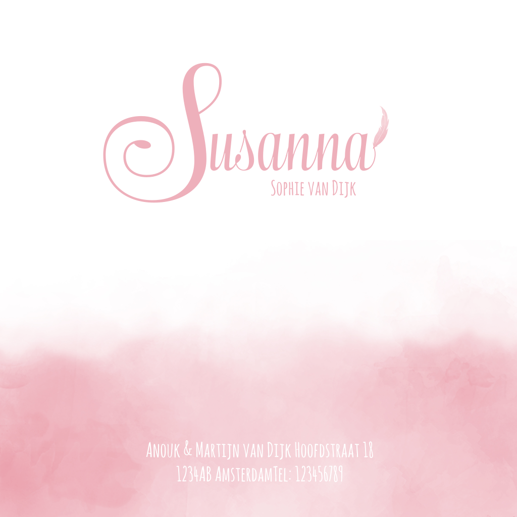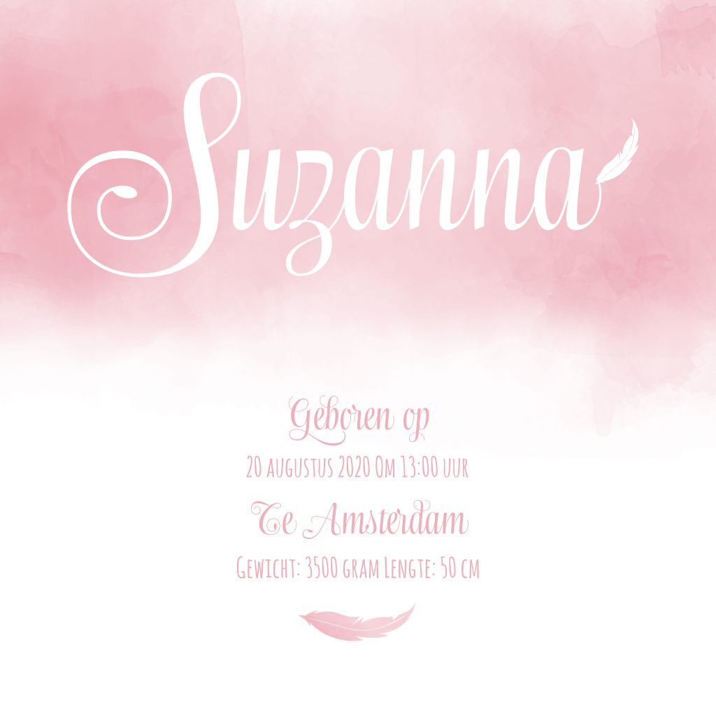 De sierlijke letters op het watercolour laat dit geboortekaartje chic ogen. Een aquarel geboortekaartje om te versturen aan de hele familie. Vind je ook niet dat het veertje er zo leuk bij past?
