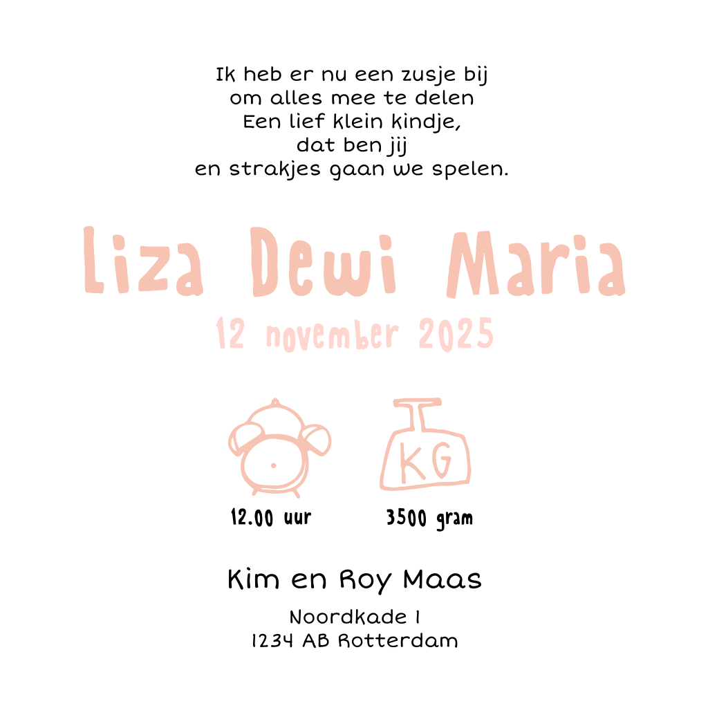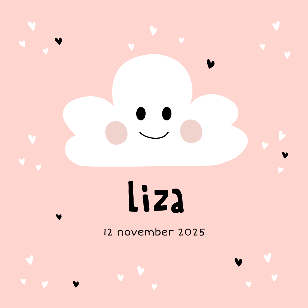 Dit lieve geboortekaartje laat een grappig wolkje zien met guitige oogjes en roze wangetjes. Het regent hartjes en er staat een stoer geschreven babynaam.