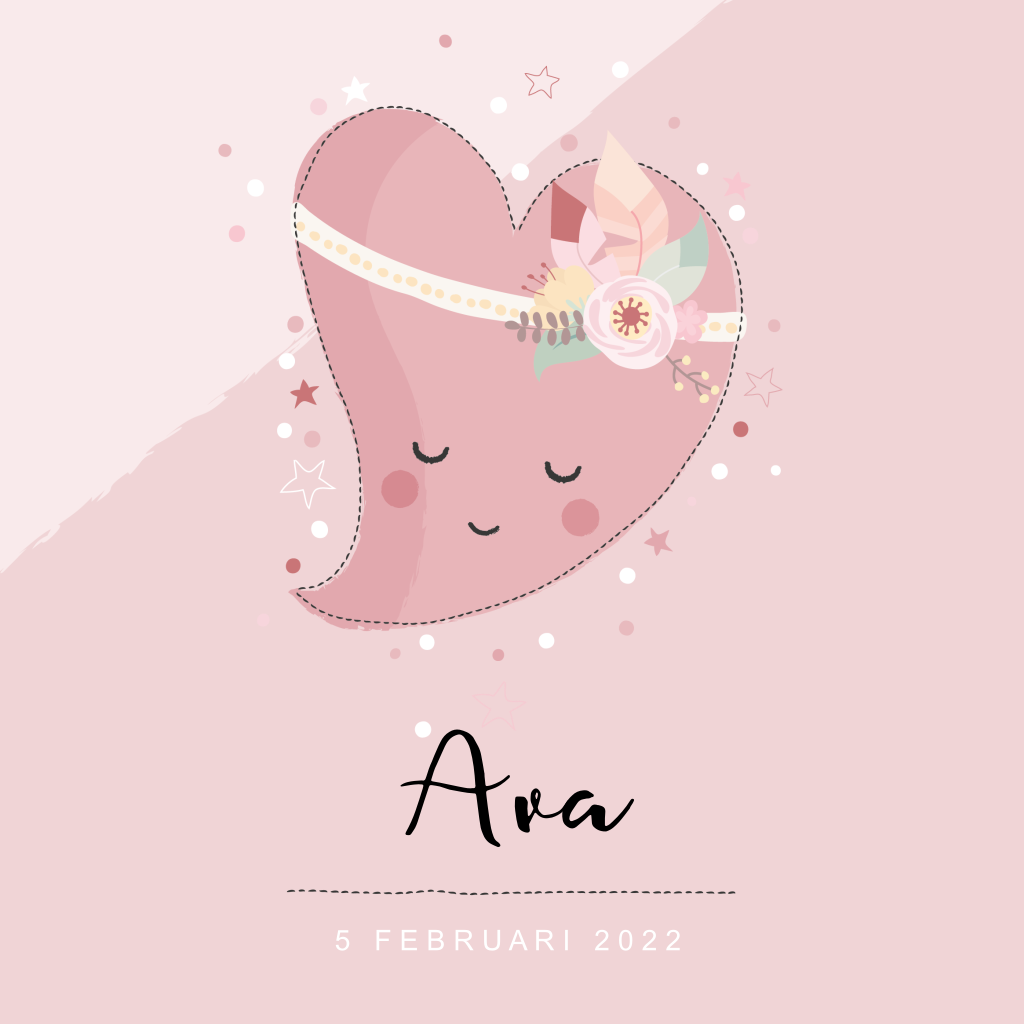 Schattige geboortekaart met roze hart, bloemen en sterretjes