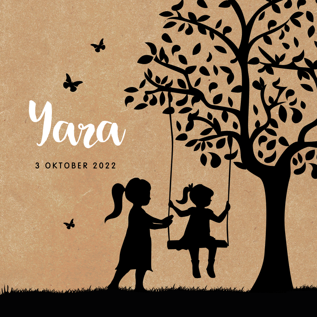 Lieve geboortekaart met de silhouet van 2 meisjes en schommel