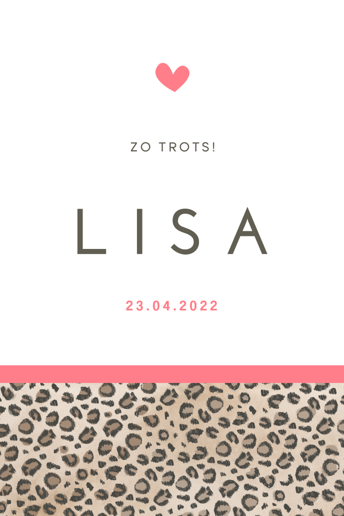 Wordt jullie meisje net zo'n fashionista als haar mama? Dan is dit bijzondere geboortekaartje perfect! Het leuke panterprintje komt ook weer terug op de achterkant in combinatie met een hip lettertype. Tip: De roze envelop past perfect bij dit geboortekaartje. Let op: Deze kaart heeft een langere verzendtijd: voor 18.00 uur besteld = de volgende werkdag gedrukt en verzonden. Minimale bestelhoeveelheid: 20 stuks.