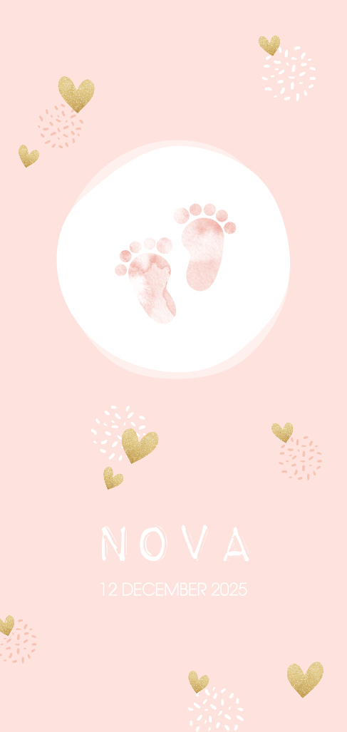 Hippe geboortekaart met watercolor voetjes voor een meisje. De hartjes met goud-look staan er lief omheen.