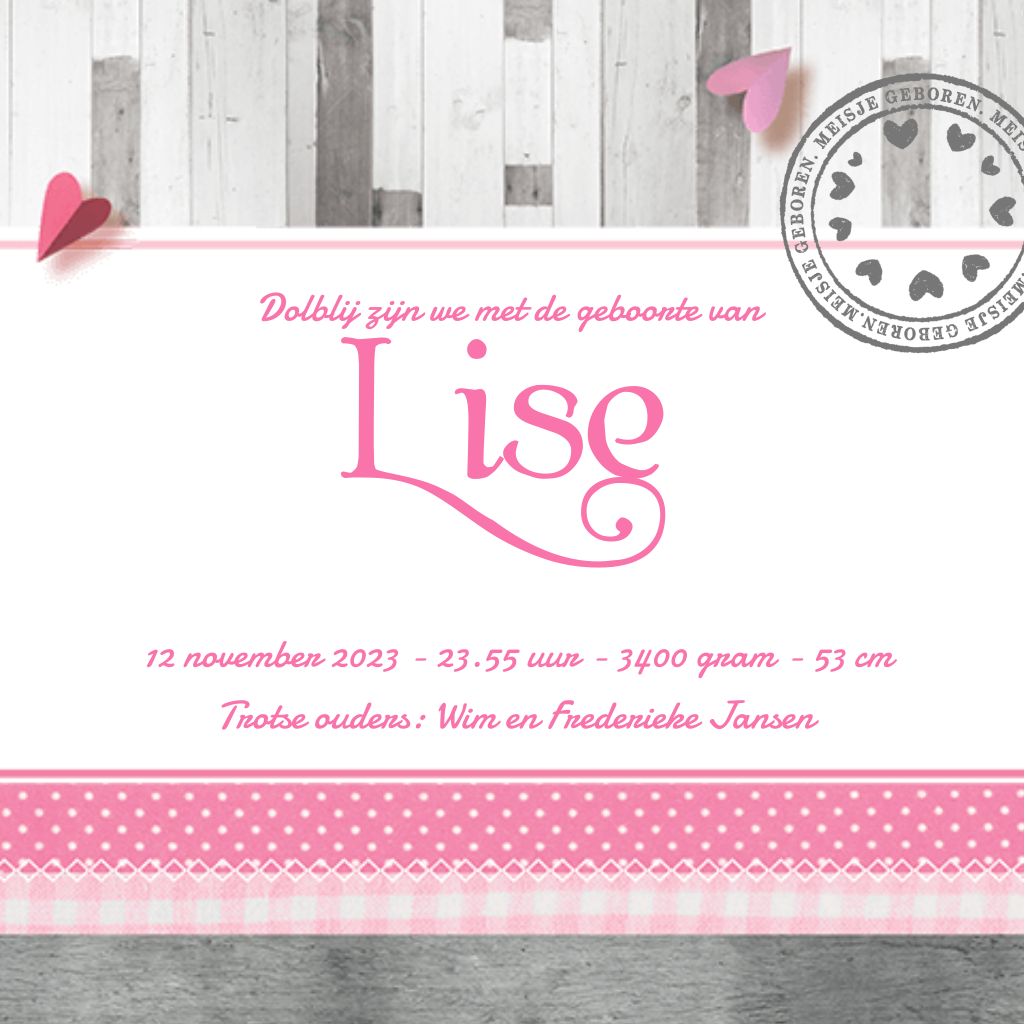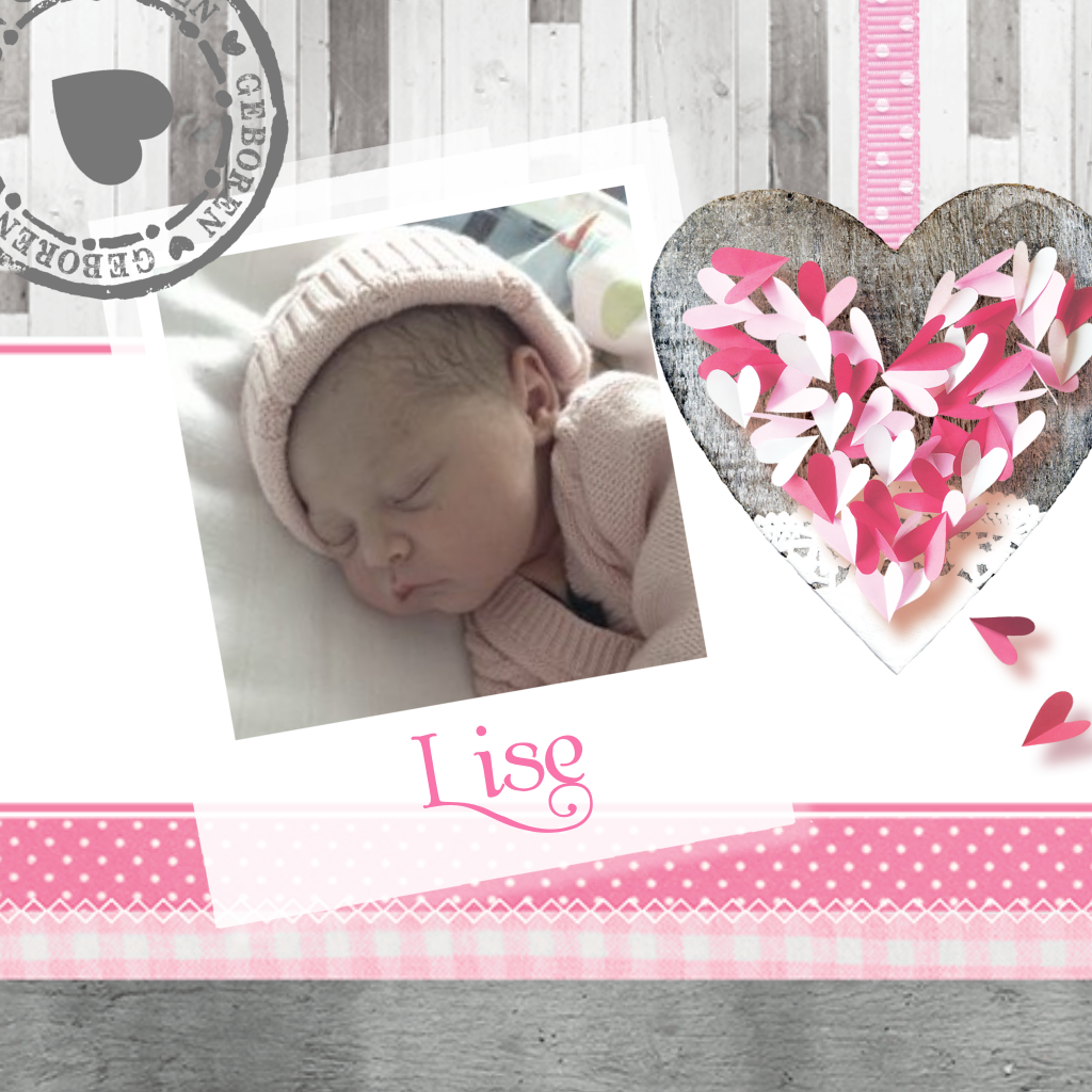 Scrapbook geboortekaartje voor een meisje met stofjes, papieren hartjes, een geboortestempel, een foto van je meisje en een achtergrond van hout. Hoe leuk is dat?