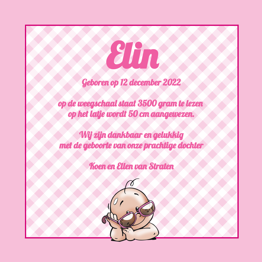 Een geboortekaartje met een cartoon van een baby met een big smile en een zonnebril op, wat grappig en origineel! De roze achtergrond met ruitjes en de lichtroze rand geven dit kaartje net even iets extra's. Leuk voor een kleine meid!