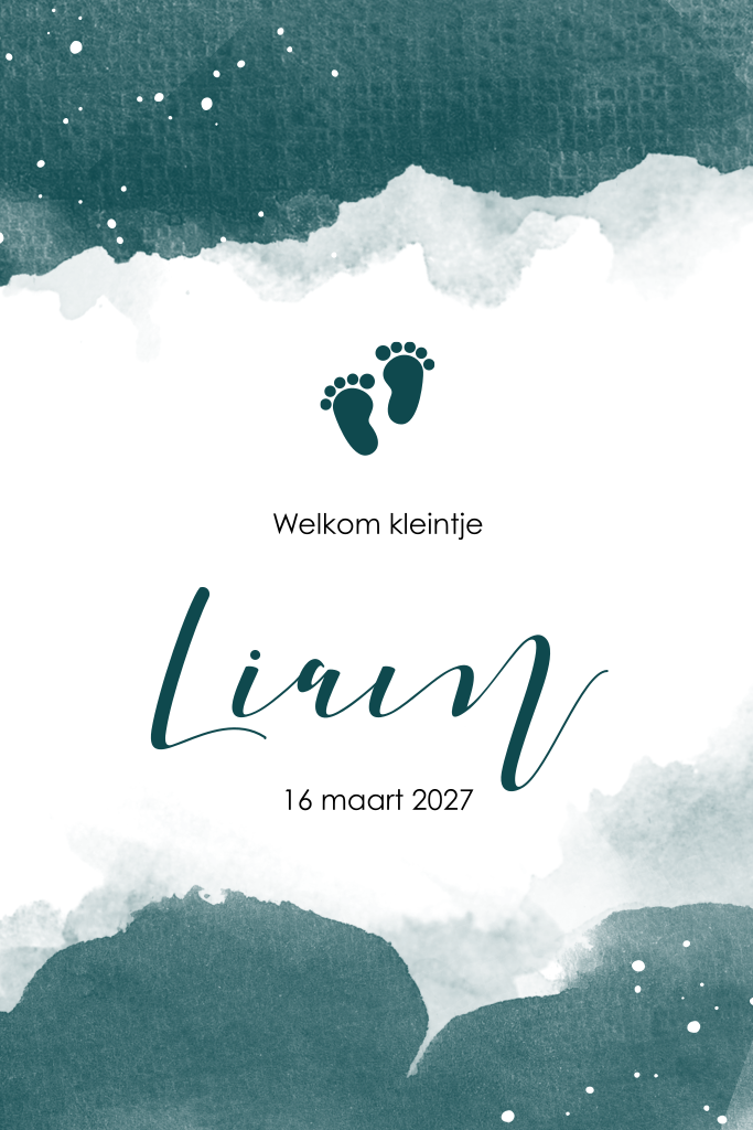Trendy geboortekaartje met blauwe waterverf look, voetjes en verfspetters. De naam van de newborn heeft een stijlvolle typografie. Wil je liever net wat anders? Dat is zo gedaan in onze online editor. Hier pas je de kleuren, het lettertype en de tekst aan voor een geboortekaartje dat helemaal bij jouw wensen past. Je kunt ook een proefdruk bestellen om snel te zien hoe het er in het echt uitziet.