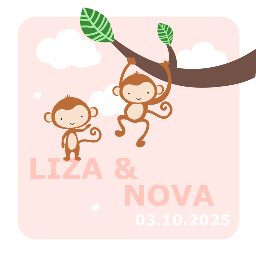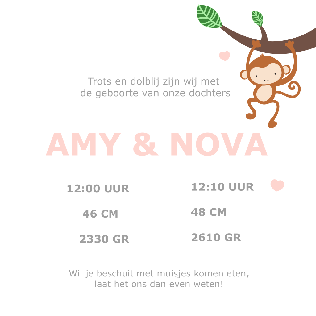 Geinig tweelingkaartje met aapjes voor een meisjes tweeling. Dit tweelingkaartje kan voor zowel een eeneiige tweeling als twee-eiige tweeling worden gebruikt.