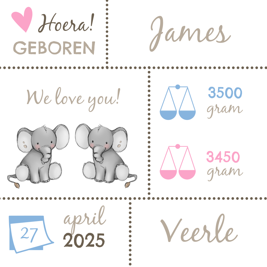 Lief geboortekaartje voor een tweeling! Met getekende olifantjes, een hartje, kalender en weegschalen. De stippellijnen maken dit doddige kaartje helemaal af!