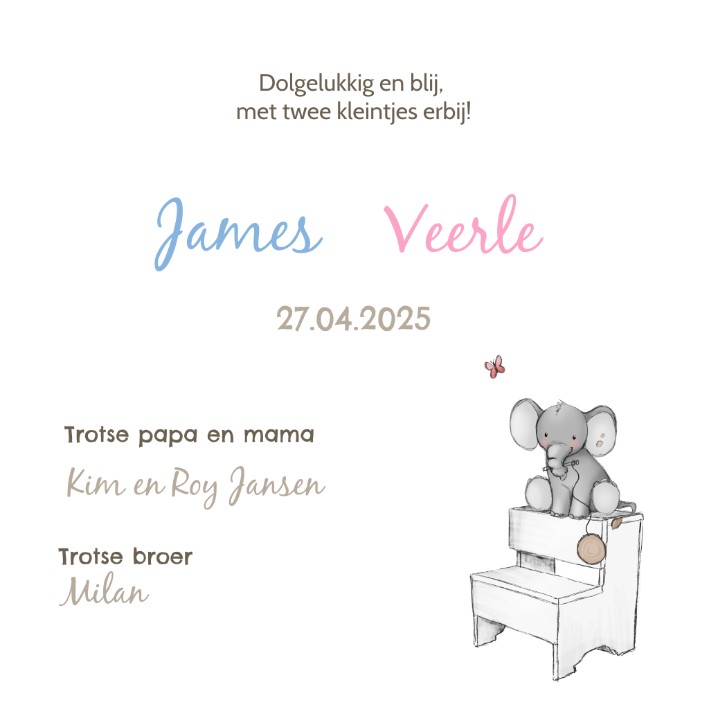 Geboortekaartje voor tweeeiige tweeling met olifanten
