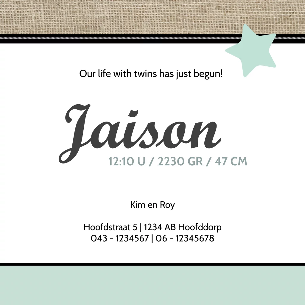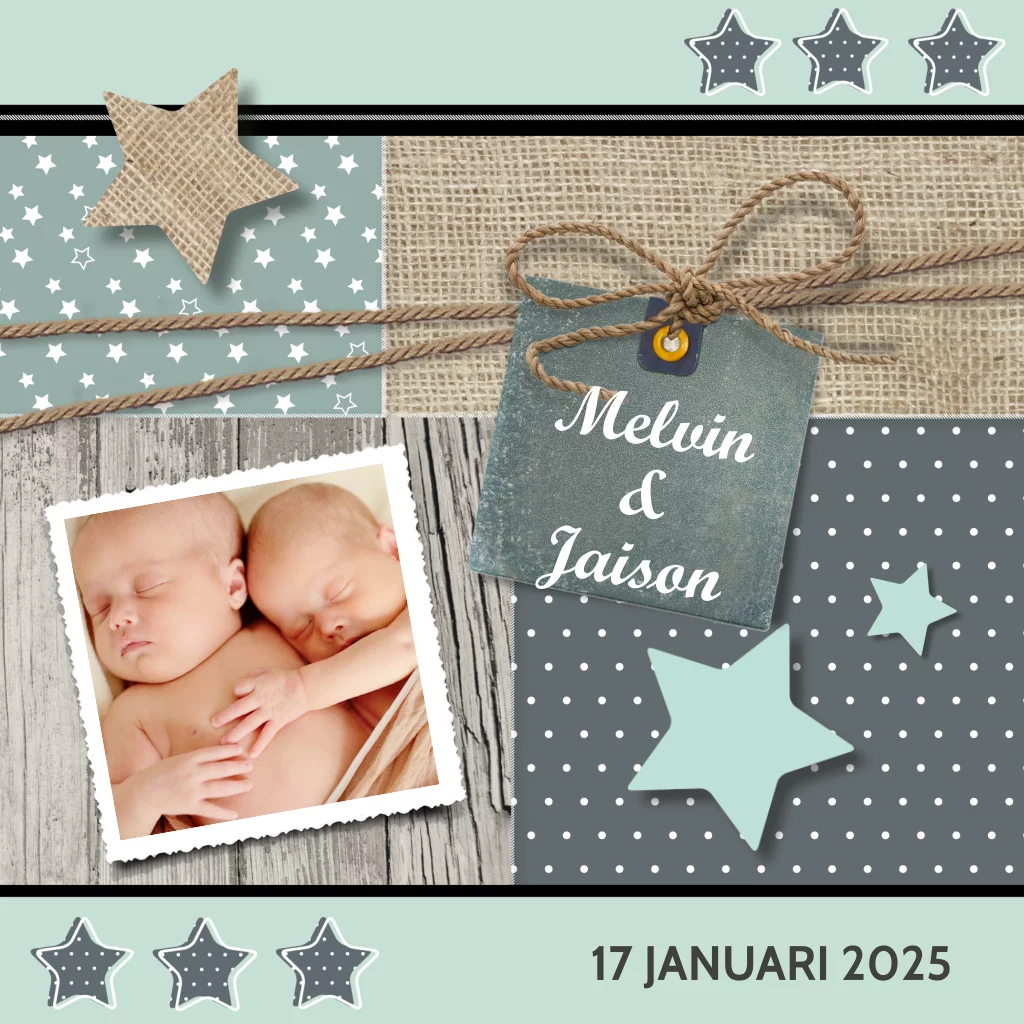 Origineel geboortekaartje voor een jongens tweeling. Het kaartje heeft een stoer uiterlijk door het gebruik van sterren, jute en touw.