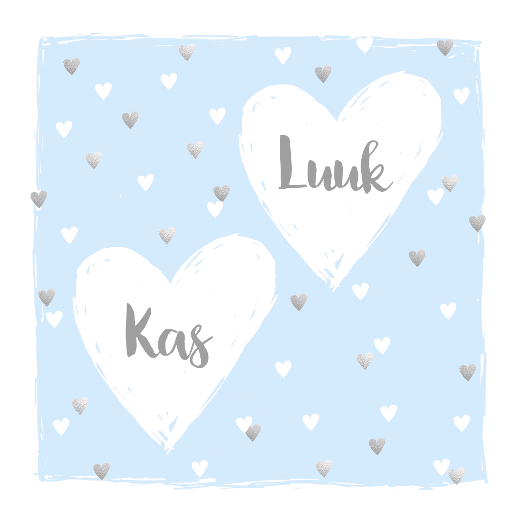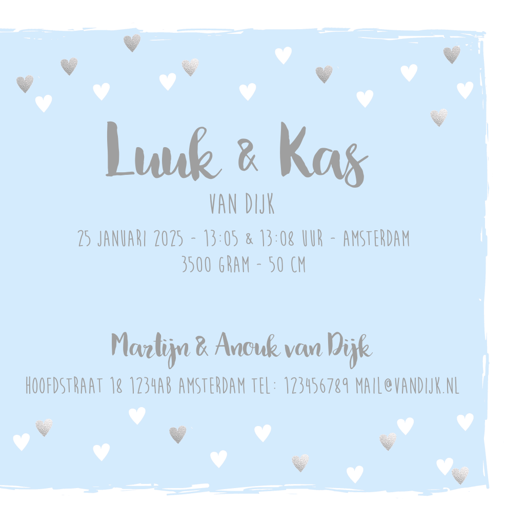 Een lief en hip geboortekaartje zacht blauwe achtergrond met witte en zilveren hartjes voor een tweeling. Je kan zelf de achtergrondkleur, lettertypes en de teksten aanpassen.