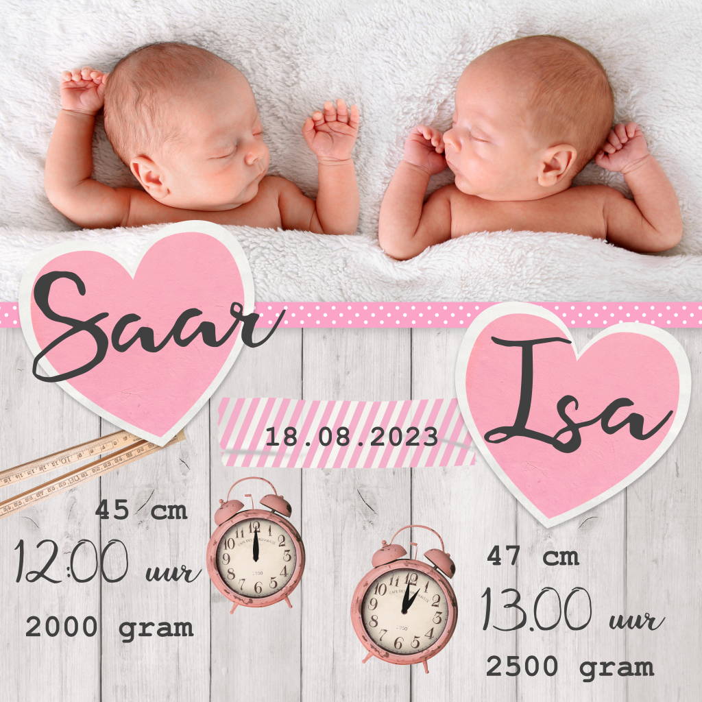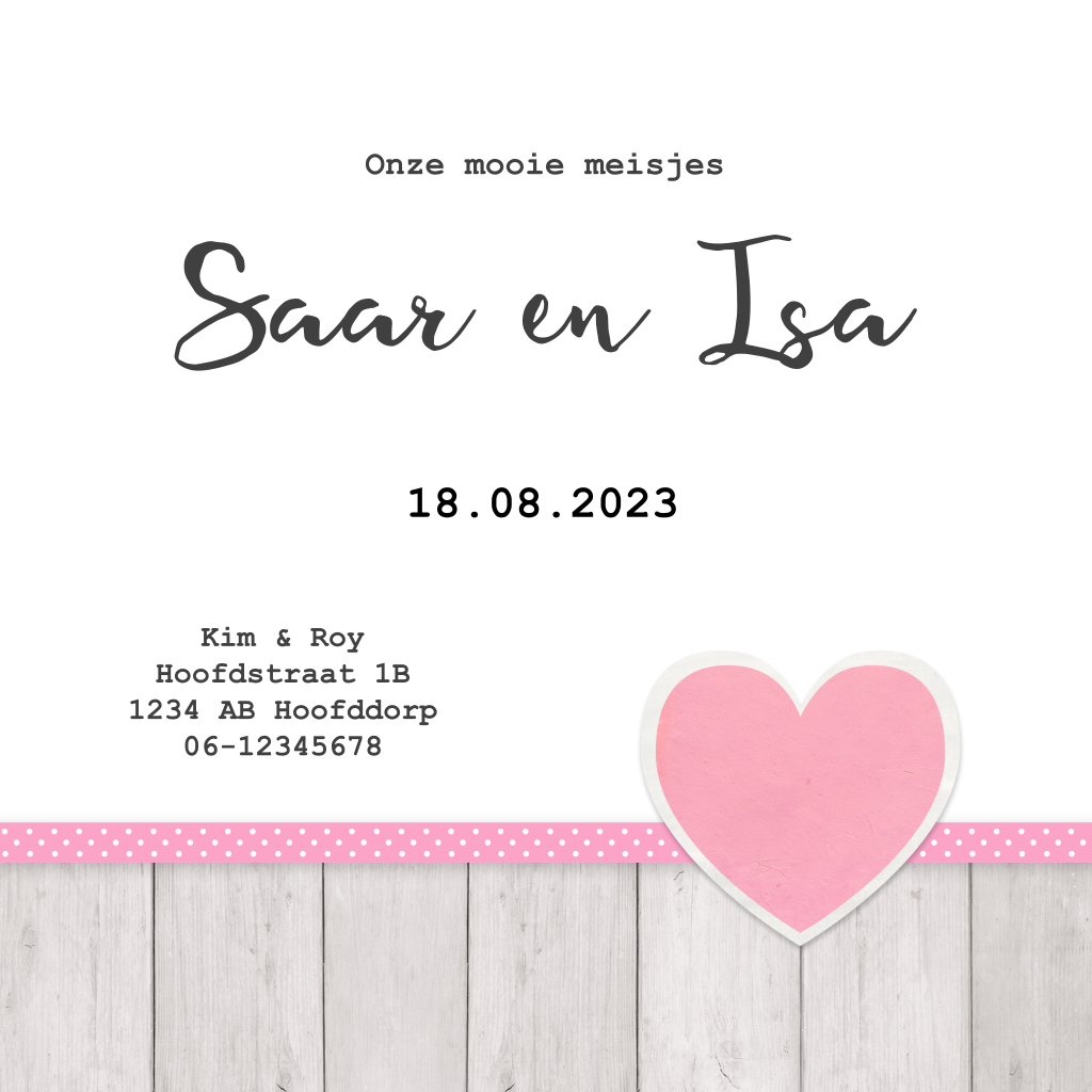 Stoer tweeling geboortekaartje - Roze hart en steigerhout