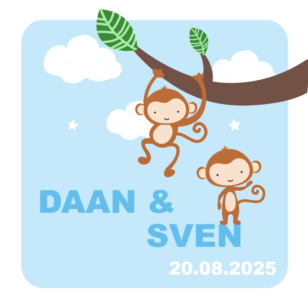Bestel dit unieke tweelingkaartje met aapjes voor jullie zoontjes. Aan de binnenzijde van dit geboortekaartjes komen de apen op speelse wijze terug in het ontwerp.