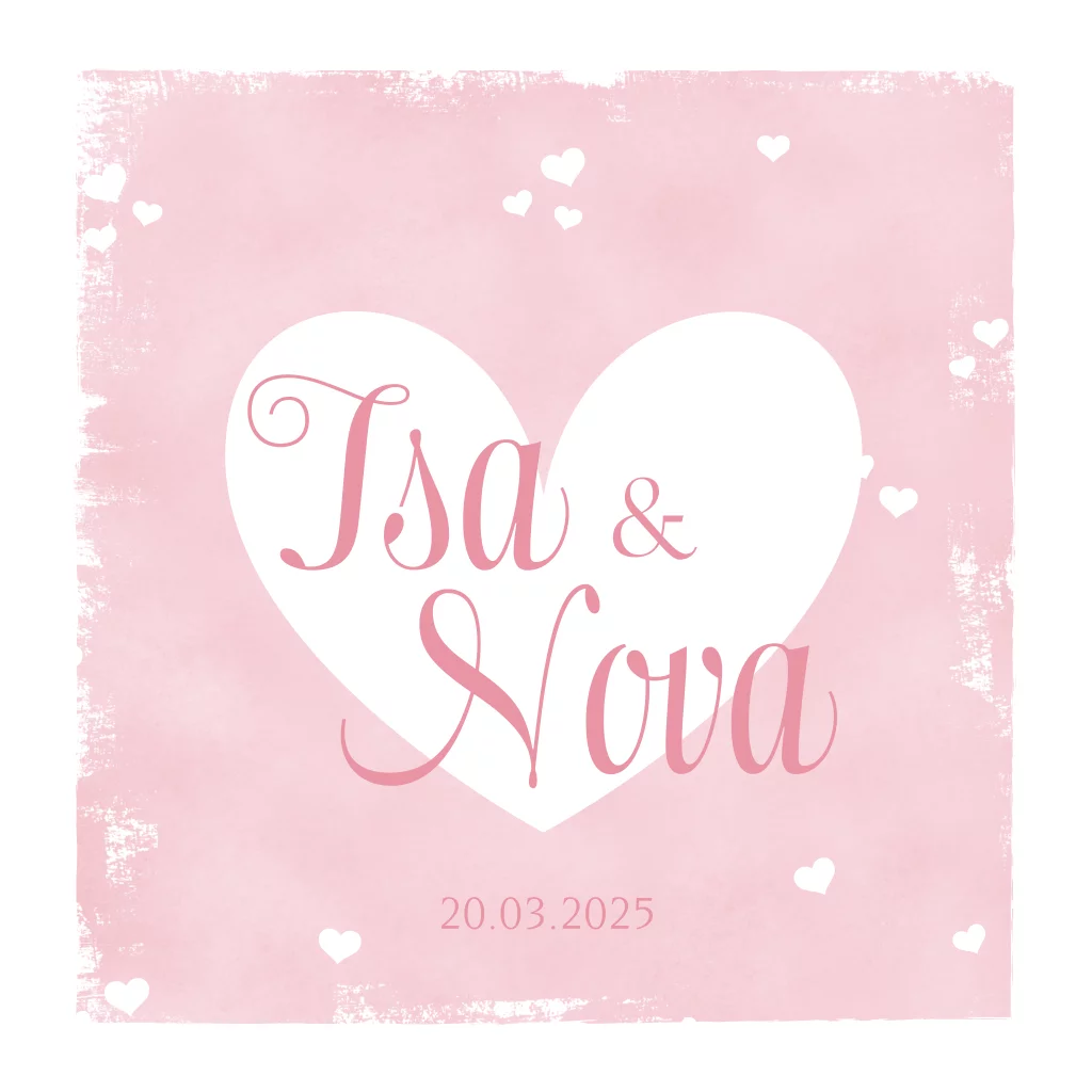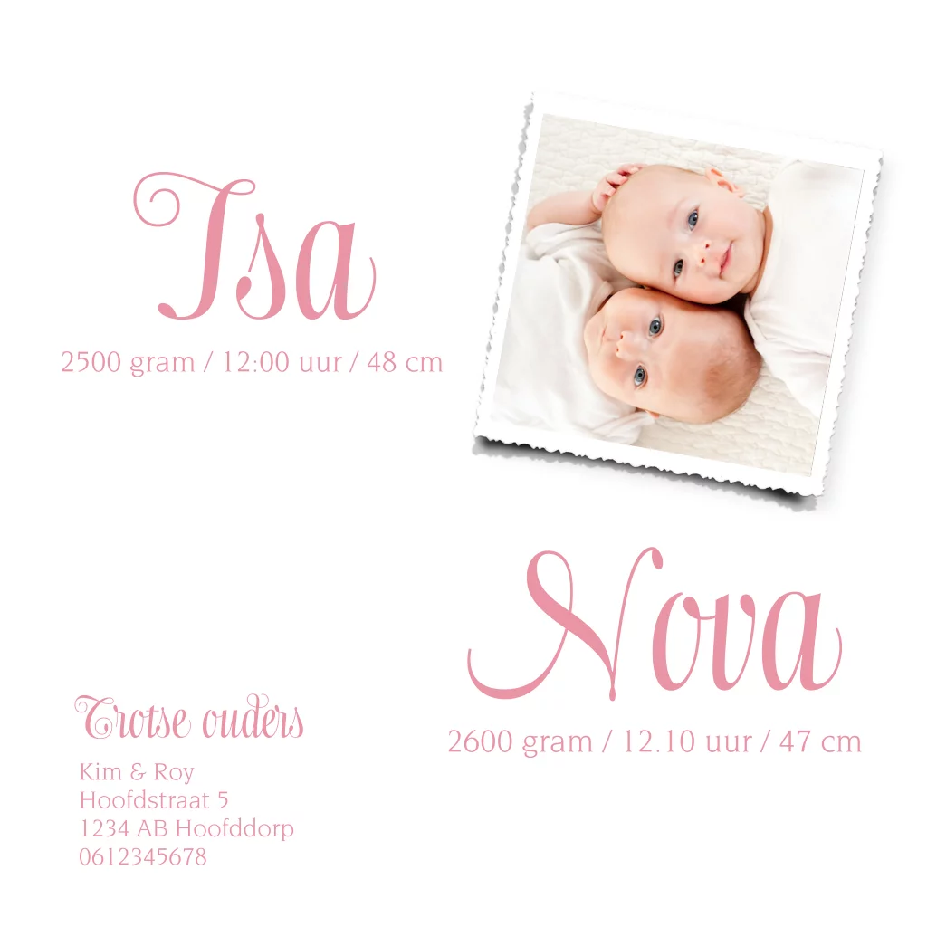 Lief geboortekaartje voor een meisjestweeling. Aan de binnenzijde is een fotokader geplaatst waarin je een foto van jullie meisjes kan plaatsen.