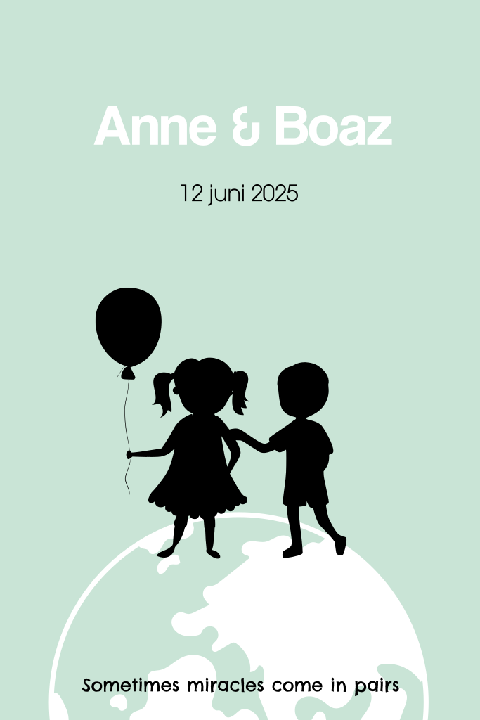 Tweeling geboortekaartje met silhouetten en wereldbol in mintgroen