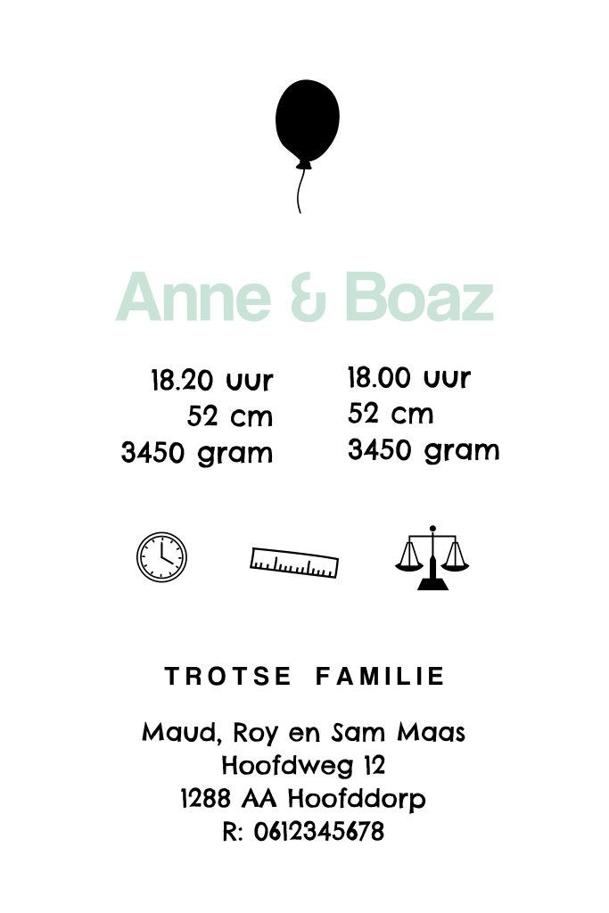 Hip geboortekaartje voor tweeling met een jongen en meisje die een ballon vasthoud en die op de wereld staan.
