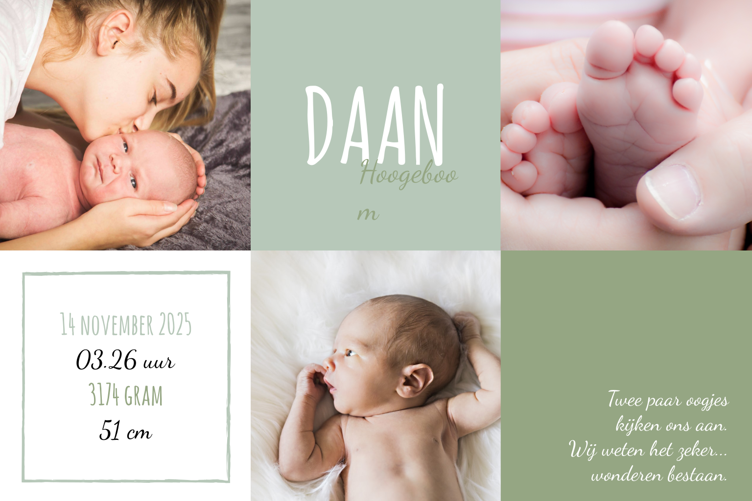 Wil je ook graag een fotokaartje versturen voor de geboorte van je zoontje? Dan is dit geboortekaartje helemaal wat je zoekt! Voeg verschillende mooie foto's toe en schrijf alle geboorte gegevens in de groene blokken.