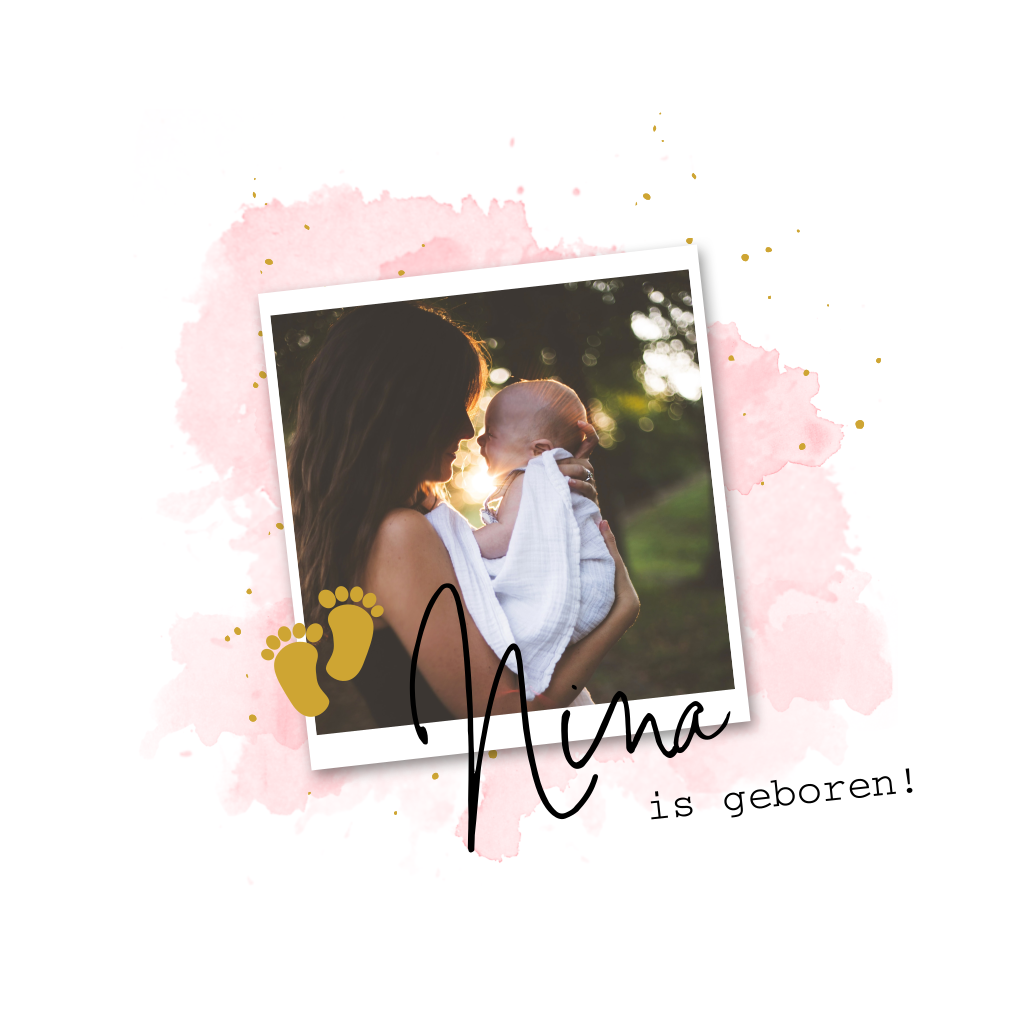 Ontwerp je eigen foto geboortekaartje met hip polaroid fotokader als basis. Kies mooie trendkleuren, plaats een mooie foto en voeg hippe clip arts toe en maak de kaart compleet!